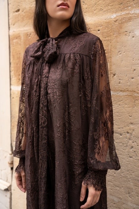 Crafted in black, this semi-sheer lace dress features a delicate floral pattern, voluminous bishop sleeves, and a soft tie-neck detail that adds a hint of drama and femininity. Its relaxed silhouette flows gracefully, making it ideal for both day-to-night styling. The gathered smocked cuffs lend structure to the airy sleeves, while the sheer overlay adds subtle sensuality. Its collar adorned with an integrated scarf offers a multitude of styles: tied in a bohemian knot, draped like a scarf, or left loose for a sleek look.