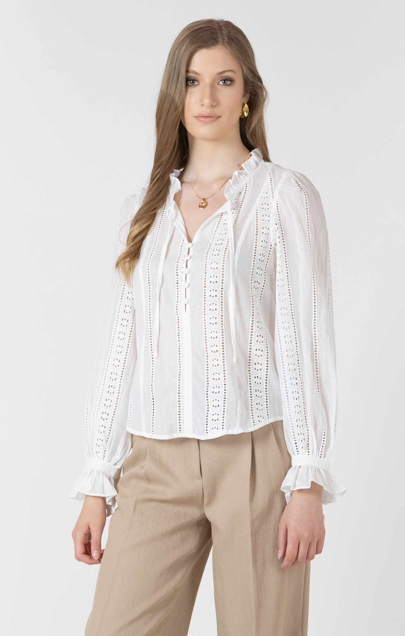 The Ariella Blouse features soft, ruffle detailing paired with delicate crochet-inspired accents for a beautifully feminine finish. Light and flowy with just the right amount of detail, it's a standout piece that elevates everyday styling with ease.