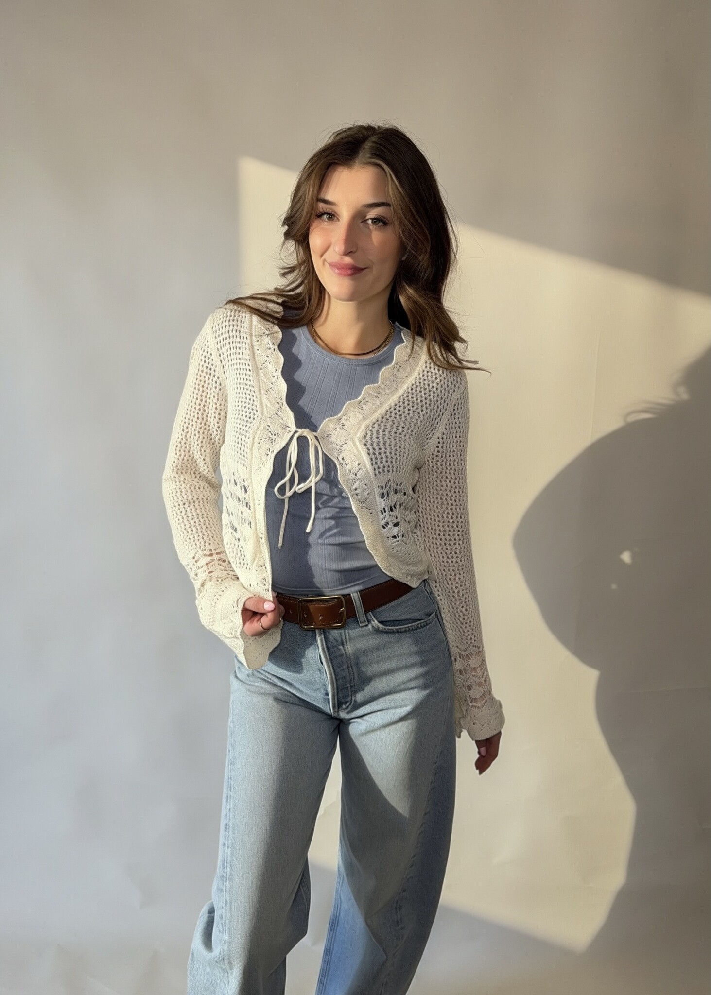 The Audrey Crochet Cardigan features a lightweight, open knit design with a charming tie front closure. Soft, feminine and easy to style, it's the perfect layer for adding a touch of boho romance to any outfit.