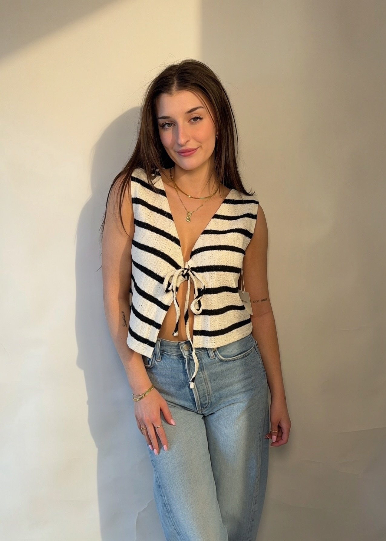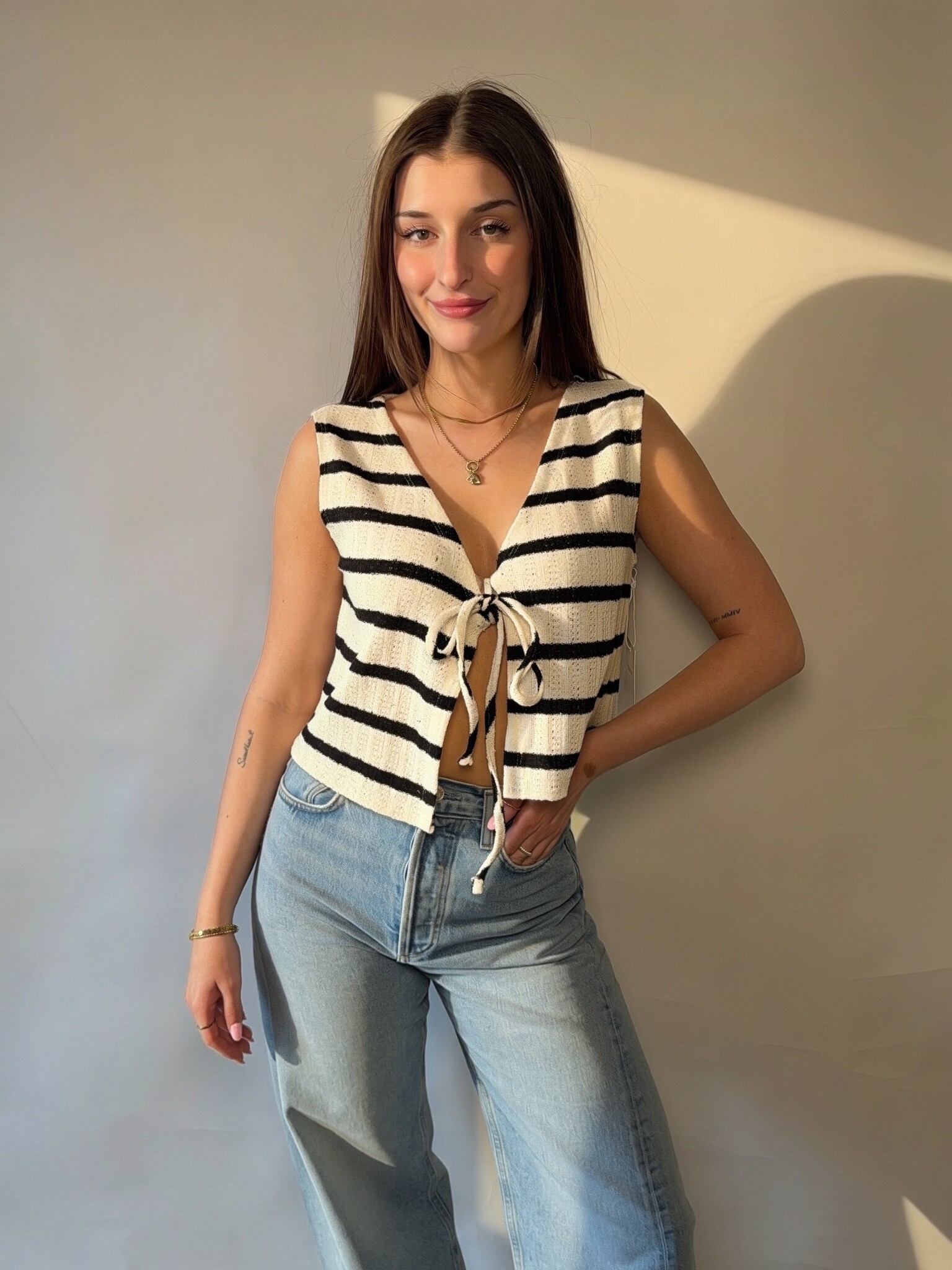 Featuring a soft textured knit, adjustable front tie closures, and a slightly cropped fit, it’s designed to hug in all the right places while still feeling relaxed. The deep V neckline adds a feminine edge, making it easy to dress up or down.