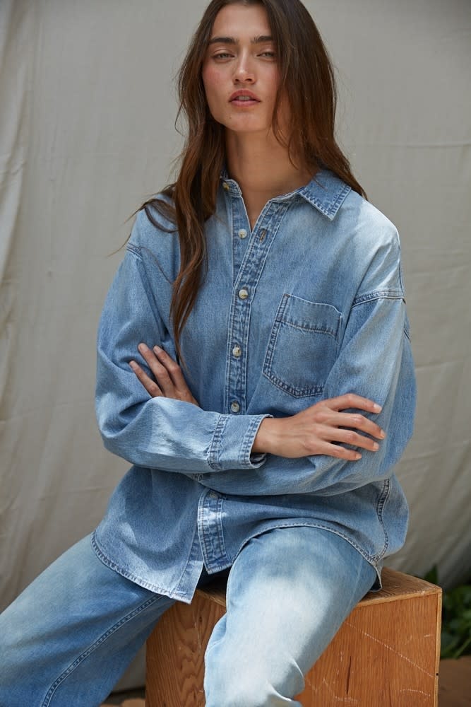 Designed for effortless, everyday style. Crafted from soft, breathable cotton denim, it features a classic collared neckline, long sleeves, and a functional front pocket for a laid-back yet polished look. The versatile silhouette makes it easy to wear tucked in, layered, or styled on its own. Perfect for casual days, work-to-weekend outfits, or easy layering year-round.
