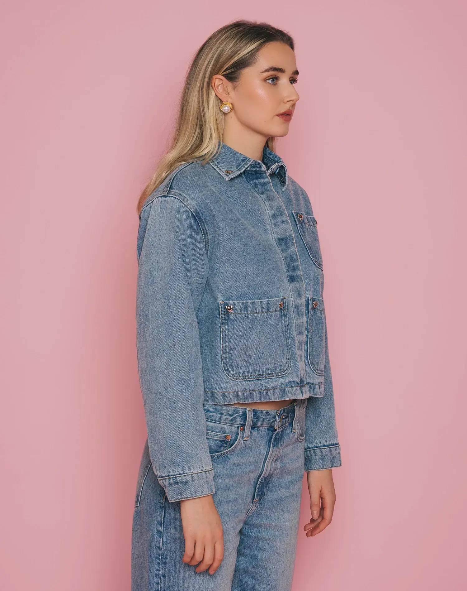 Our Magali Jacket returns in the perfect blue denim, updated with chrome heart hardware placed at the corners of the front pockets. This version features a self-fabric collar (no contrast here), a quilted lining for warmth, and a hidden front placket so the buttons stay clean and understated.