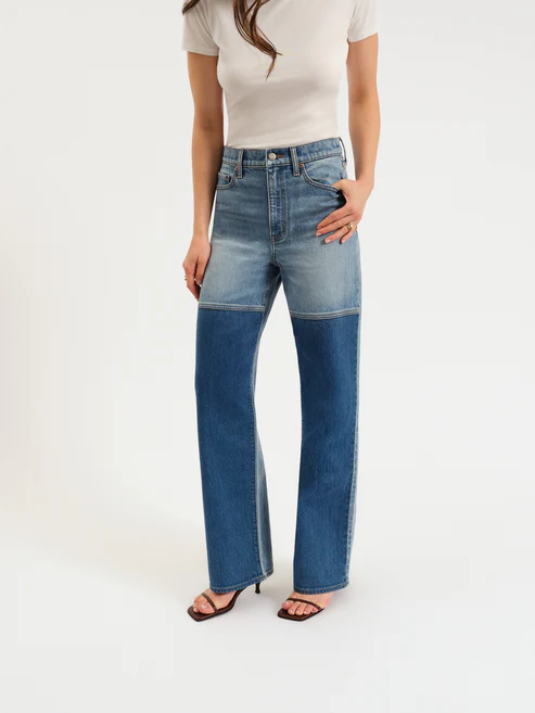 The City Straight in Double Dip is a high rise straight leg with dark wash denim panels against a light wash base. This jean is both playful and versatile – the perfect fit to carry you throughout your day. Constructed from a Tough Love fabric, this pair is mostly rigid but yields to your body in all the right ways.