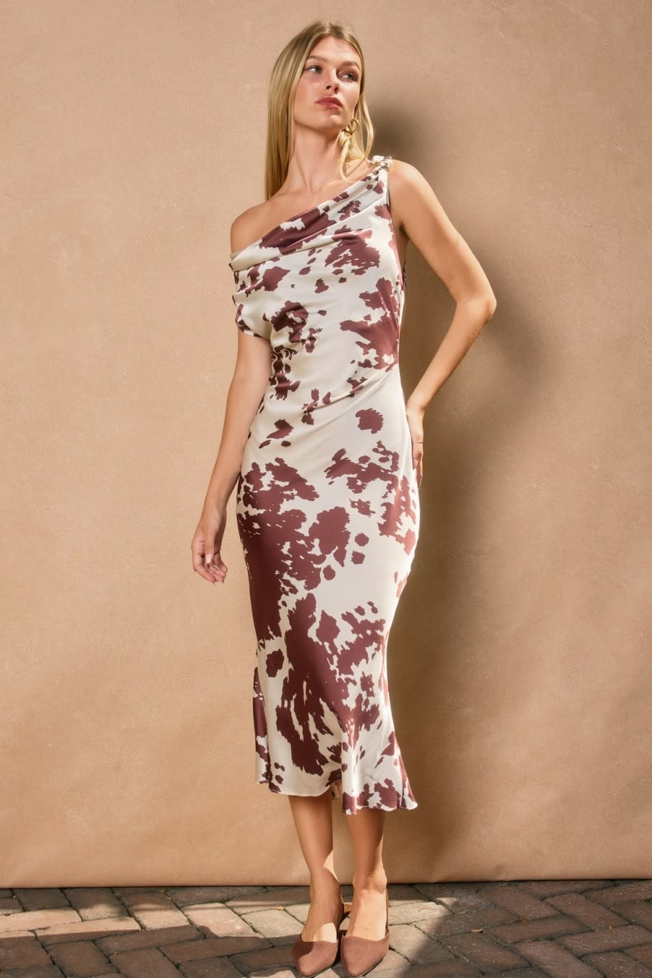 The Cow Print Satin Ruched Midi Dress brings playful edge with a polished finish. Featuring flattering ruching and a smooth, glossy feel, it hugs in all the right places while making a statement. Perfect for nights out when you want something unexpected, confident and undeniably cool.
