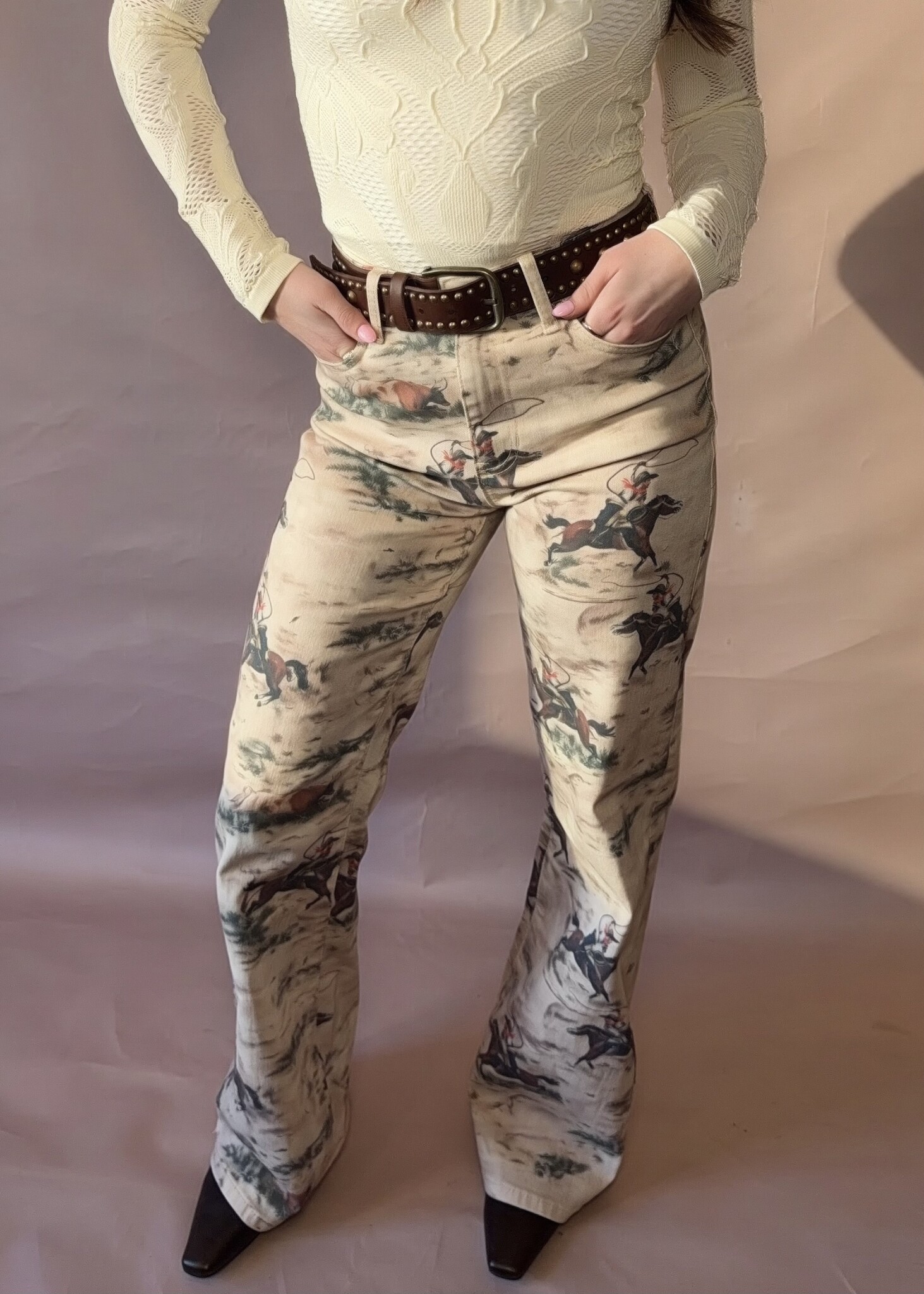 These standout jeans feature a dreamy western landscape print with cowboys and horses that feels equal parts vintage and cool-girl chic. With a flattering high rise and relaxed straight leg, they’re the perfect way to add a little wild west energy to your wardrobe.
