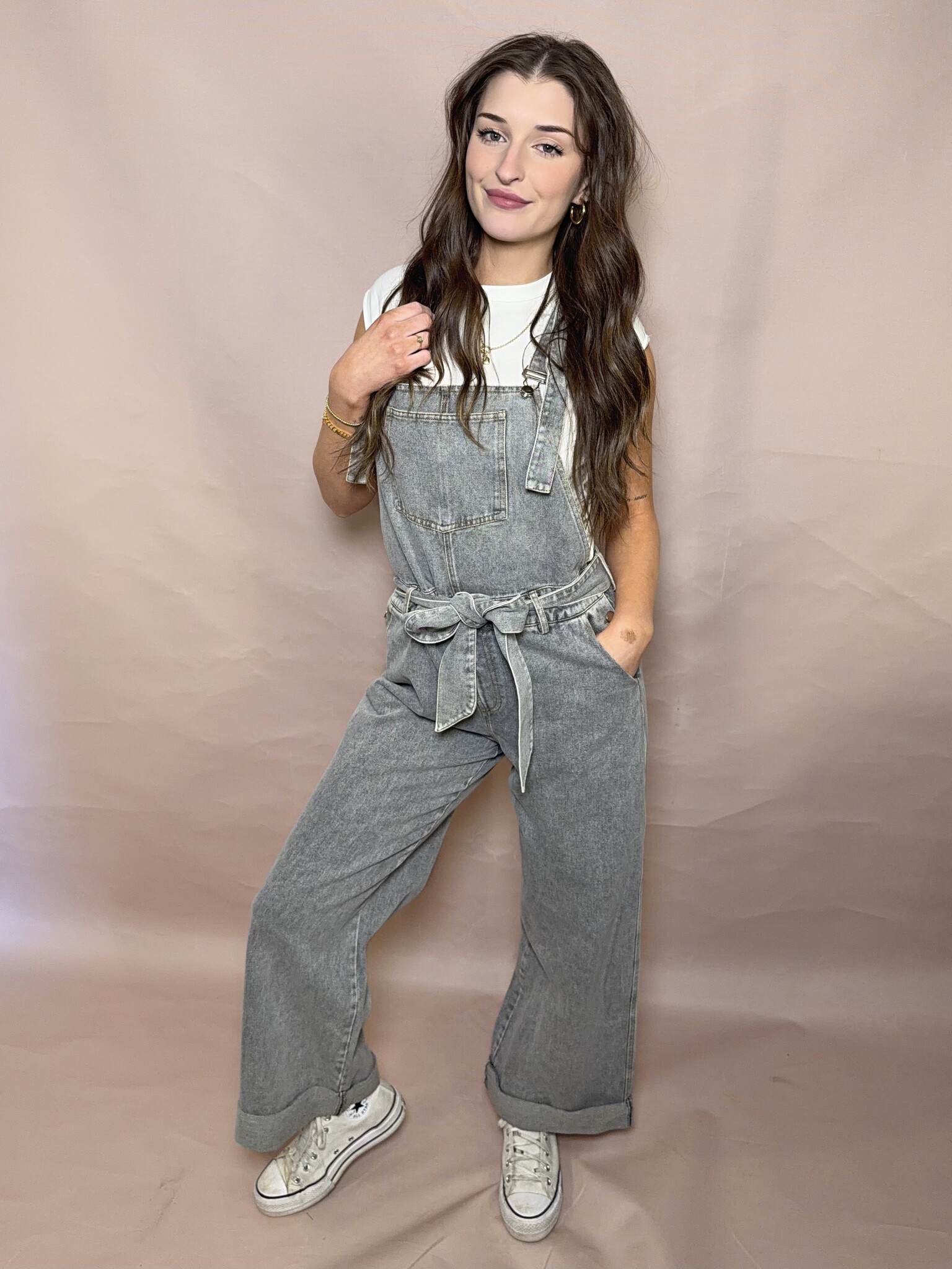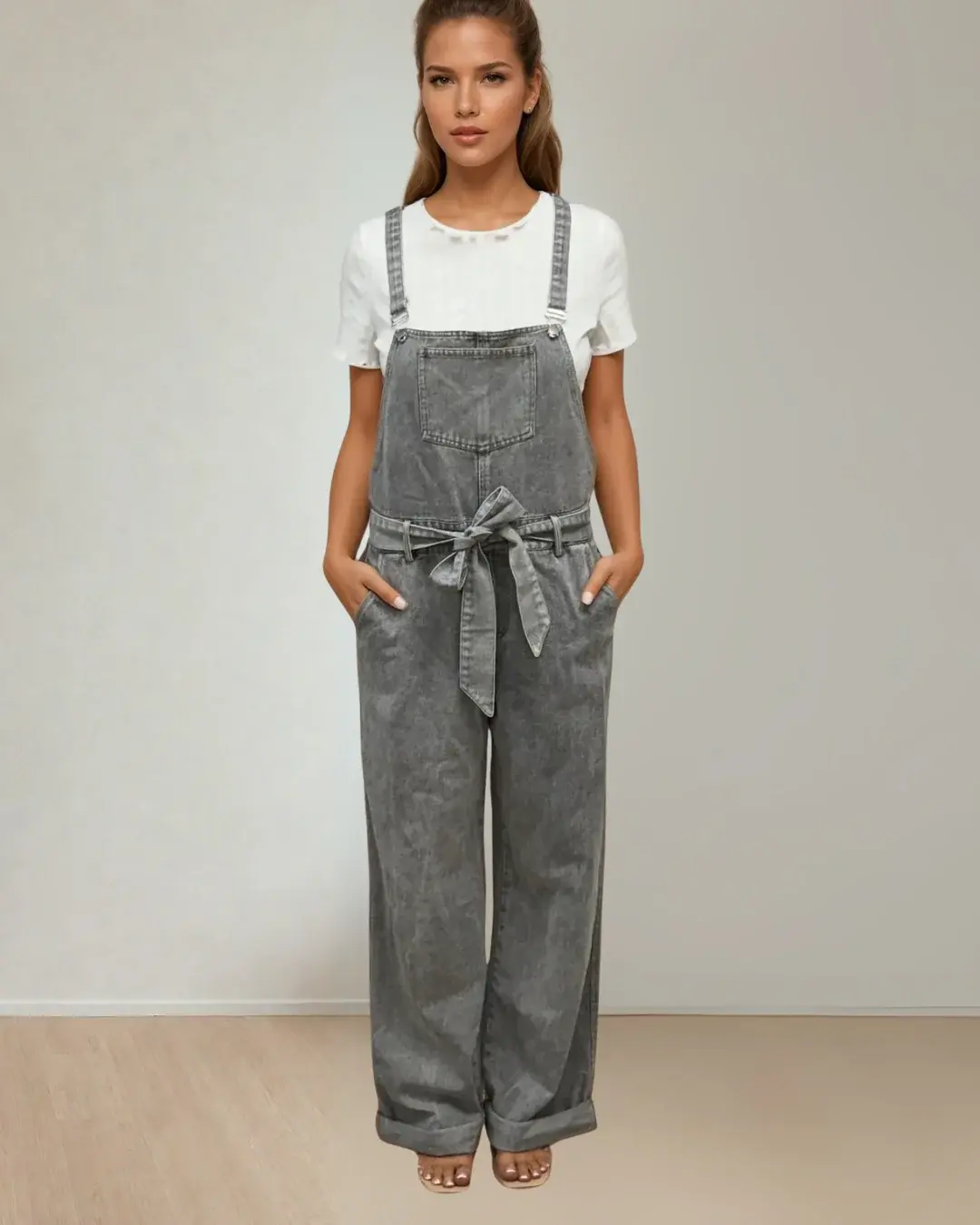 Our Della Denim Overalls are crafted in a soft faded grey denim, these overalls feature a wide-leg silhouette for a modern, relaxed fit and a matching bow belt to cinch the waist and elevate the look. Perfect for layering over tees or sweaters, they’re your new go-to for weekend adventures or casual outings.
