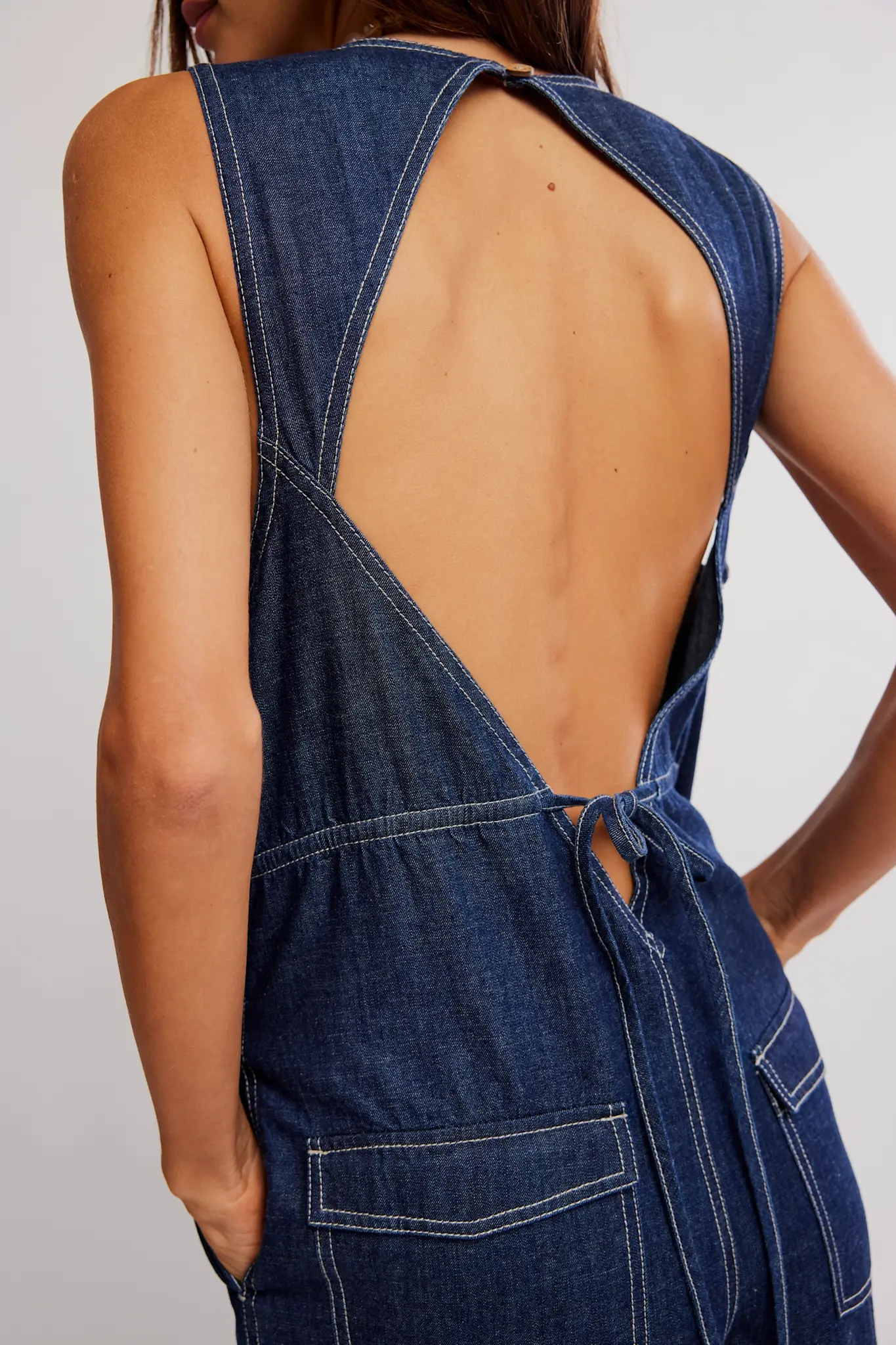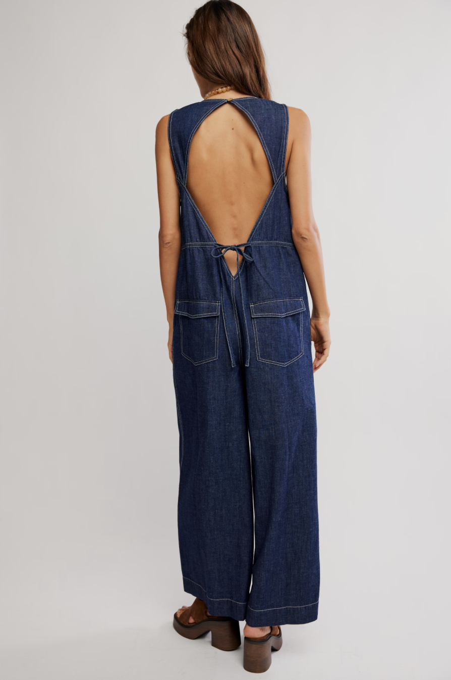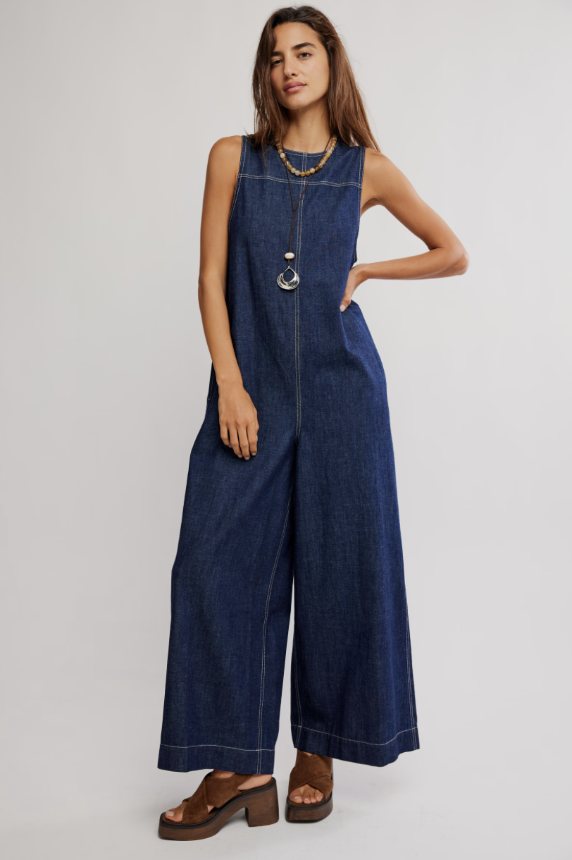 This denim jumpsuit from We The Free is featured in a lightweight chambray with wide, cropped legs and an open back for the perfect daring finish.