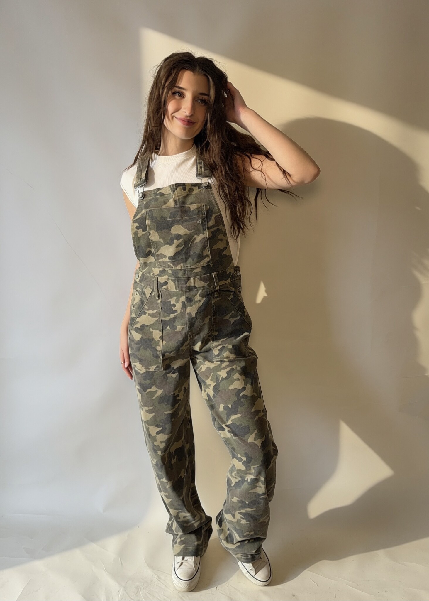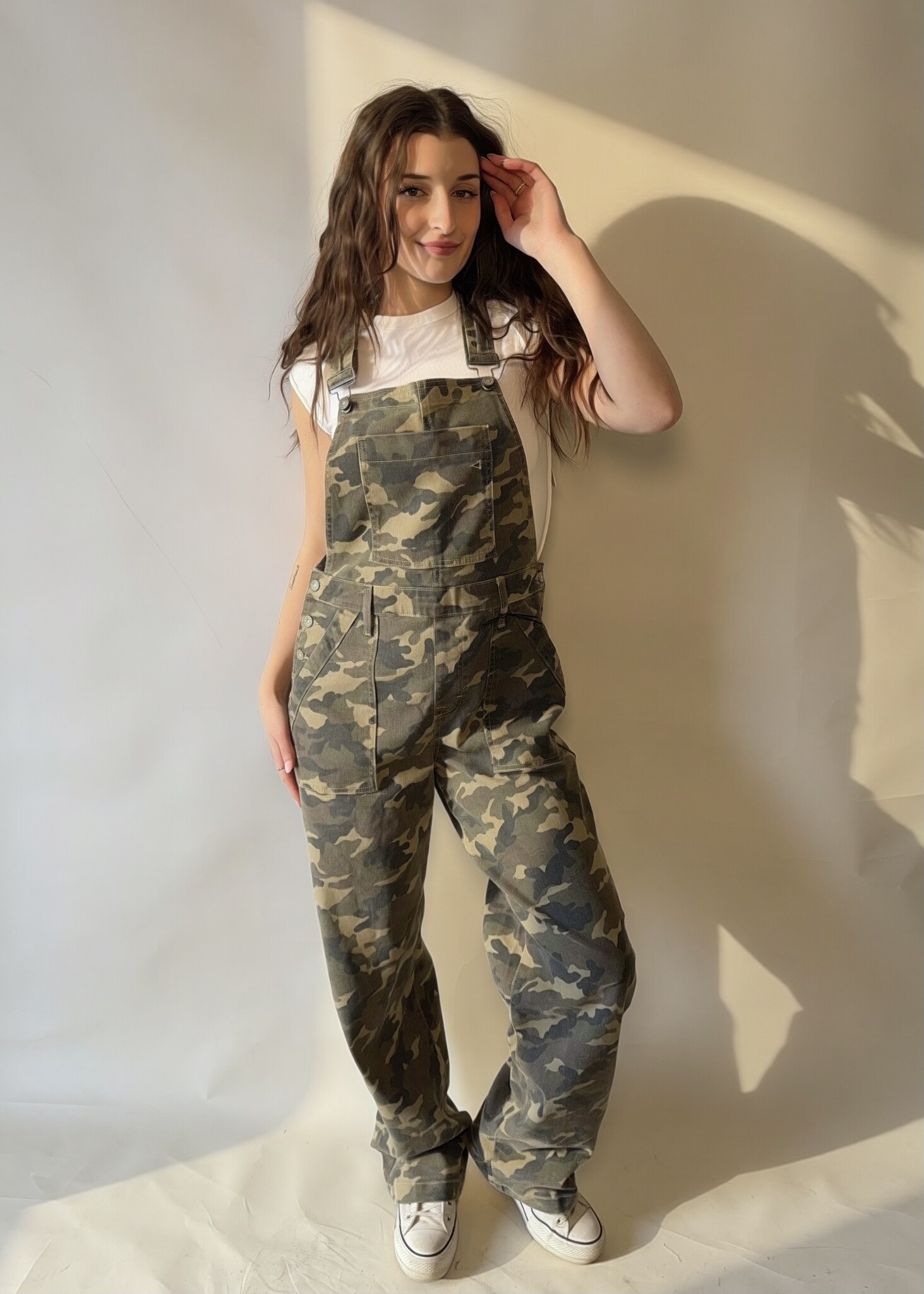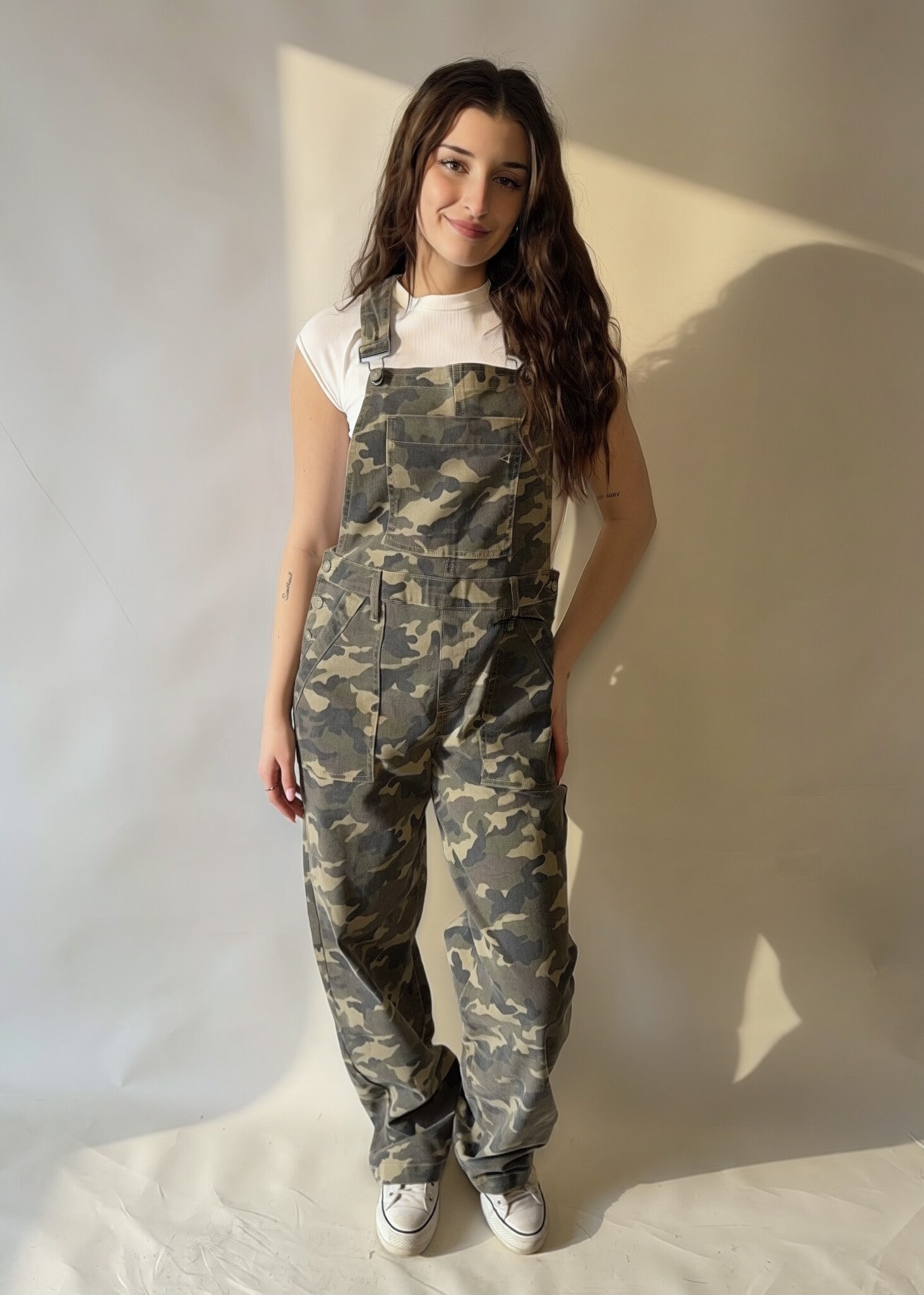 The Dylan Camo Overalls brings a playful edge to a classic silhouette. With their bold camo print, relaxed fit, and easy layering style, they're the perfect statement piece for days when you want to stand out without trying too hard.