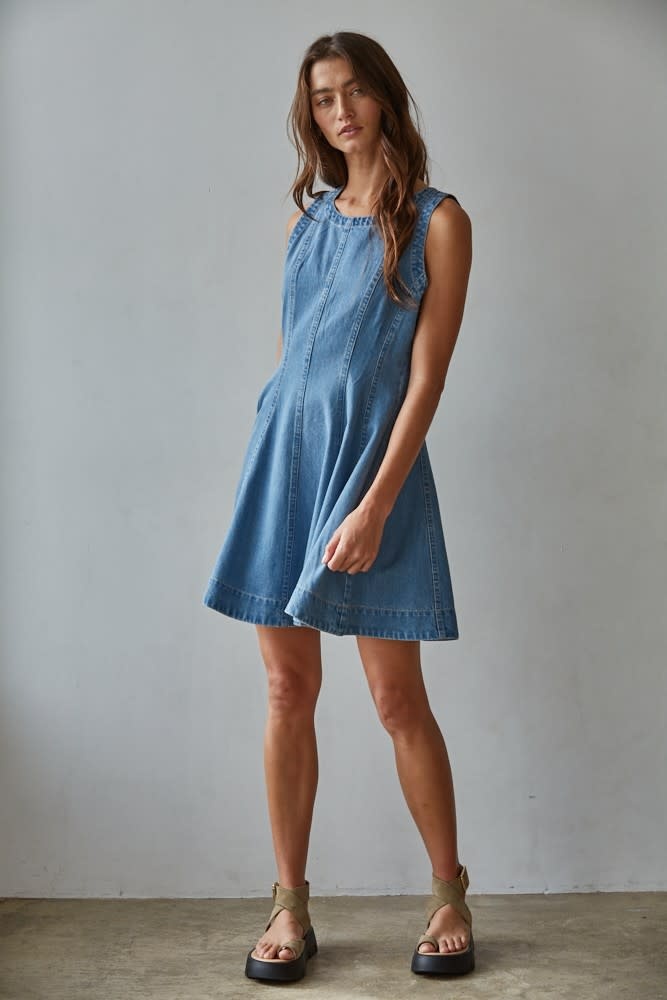 Designed in a clean, minimalist silhouette, this dress features a flattering round neckline and a sleeveless cut for easy, warm-weather styling. Crafted from a soft cotton-lyocell denim blend, it offers breathable comfort with a smooth, lightweight feel. Finished with a discreet back zipper for easy wear, this versatile mini dress is perfect for casual days, weekend outings, or dressed up with accessories for an elevated look.