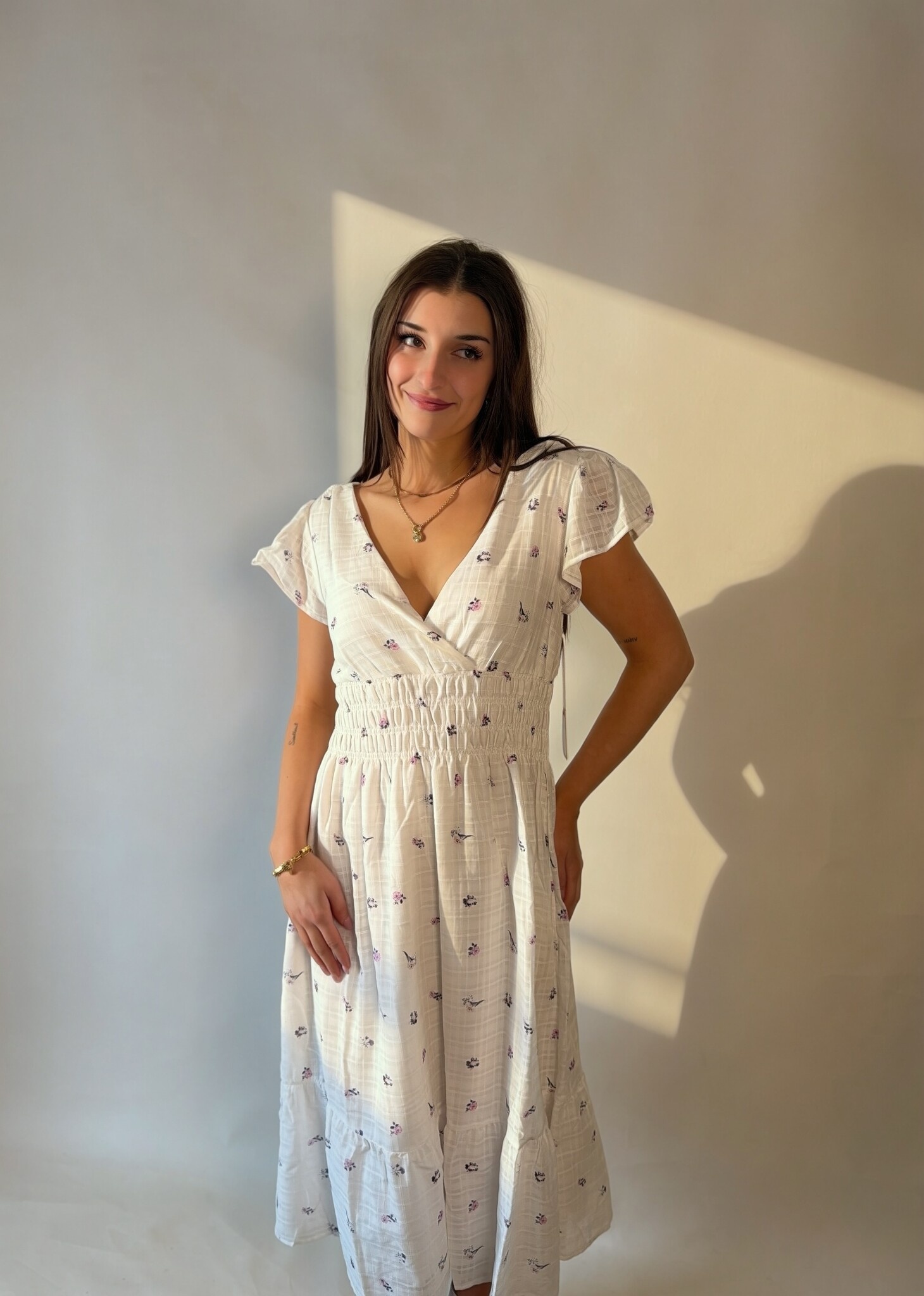 The Eden Dainty Flower Wrap Dress features a soft, feminine print and a flattering wrap silhouette that crosses perfectly at the waist. Flowing and effortlessly elegant, it's the perfect piece for garden parties and brunch dates.