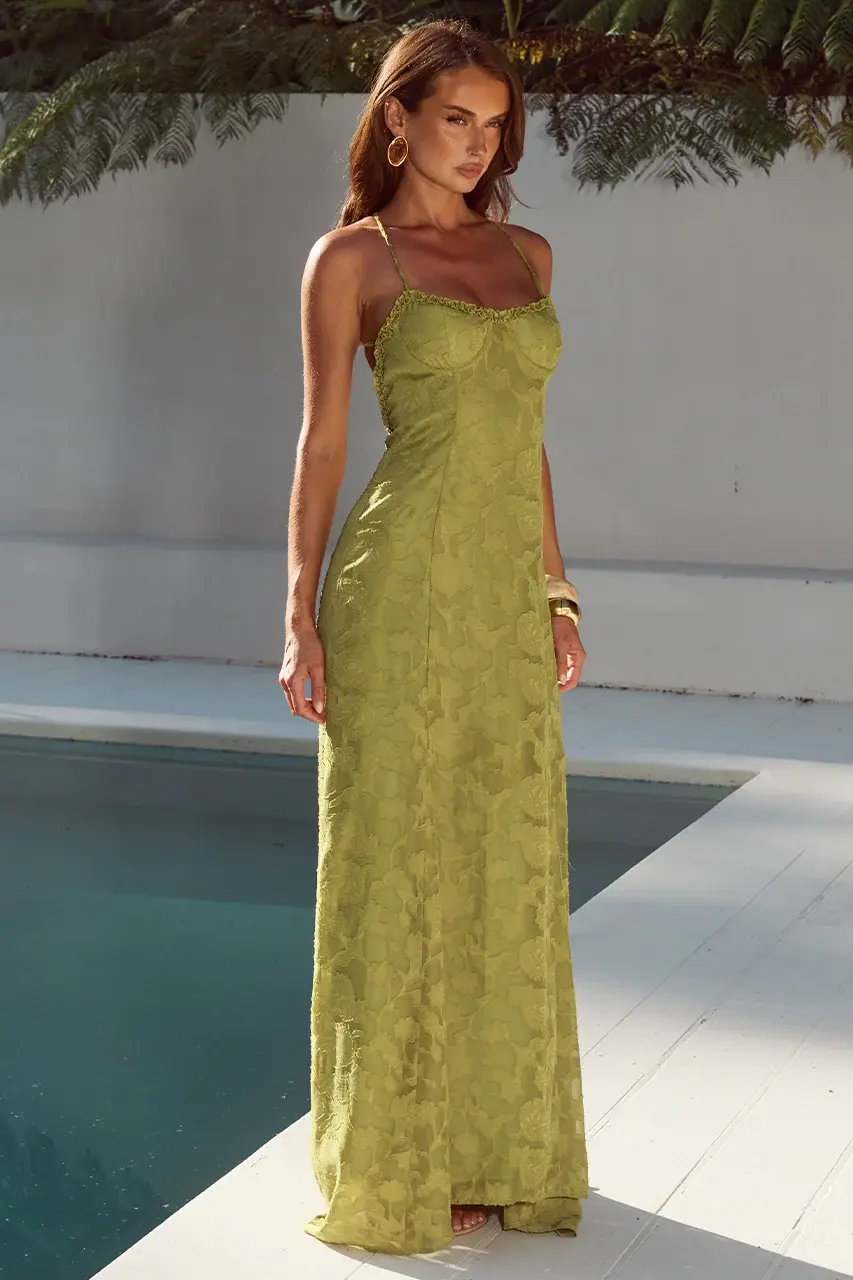 A flowing silhouette and open back, crafted from a textured floral fabric, our Ellerby Maxi Dress is an elegant wedding guest look.