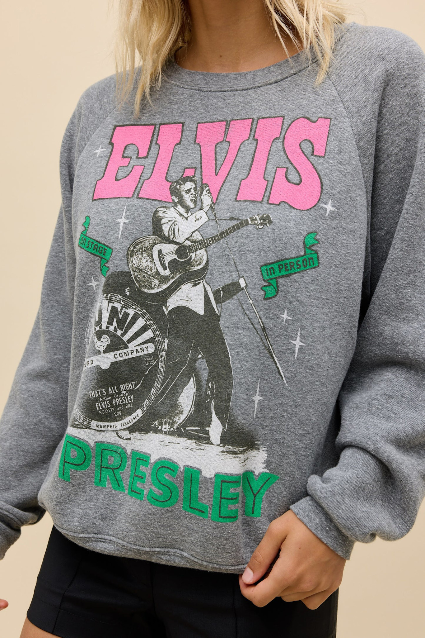 This multi-colored Vintage Raglan Sweatshirt is designed with an Elvis Presley graphic paying homage to the full personality performer. Slapped with the Sun Records label logo.