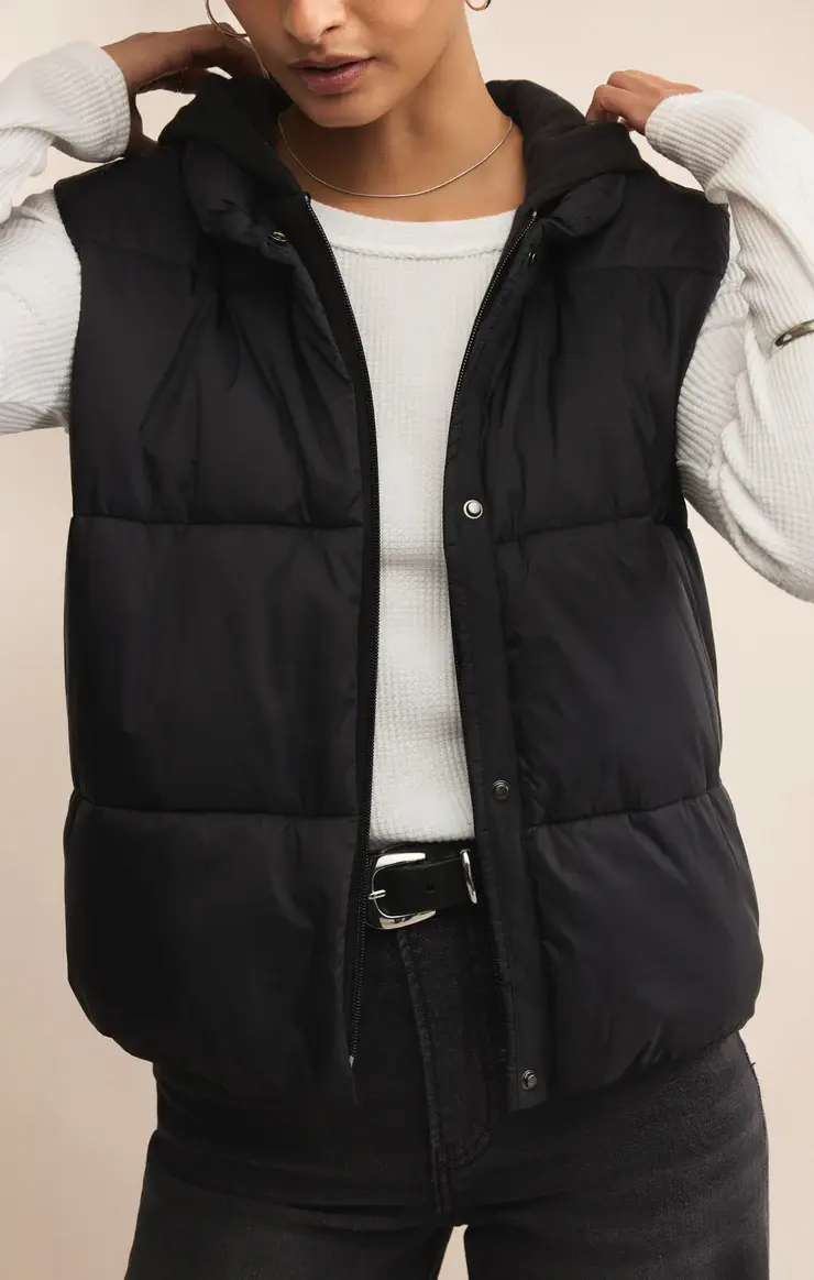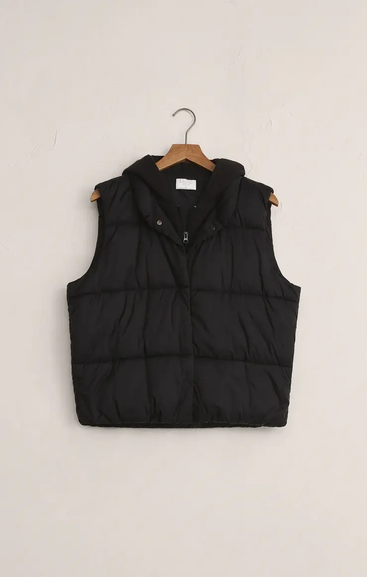 Easily layered over a soft sweater or thermal for crisp mornings. This hooded puffer blends smooth nylon taffeta with cozy cotton french terry panels for a soft-meets-structured feel. Finished with a hidden zip and snap placket, it’s perfect for crisp morning walks and city strolls.