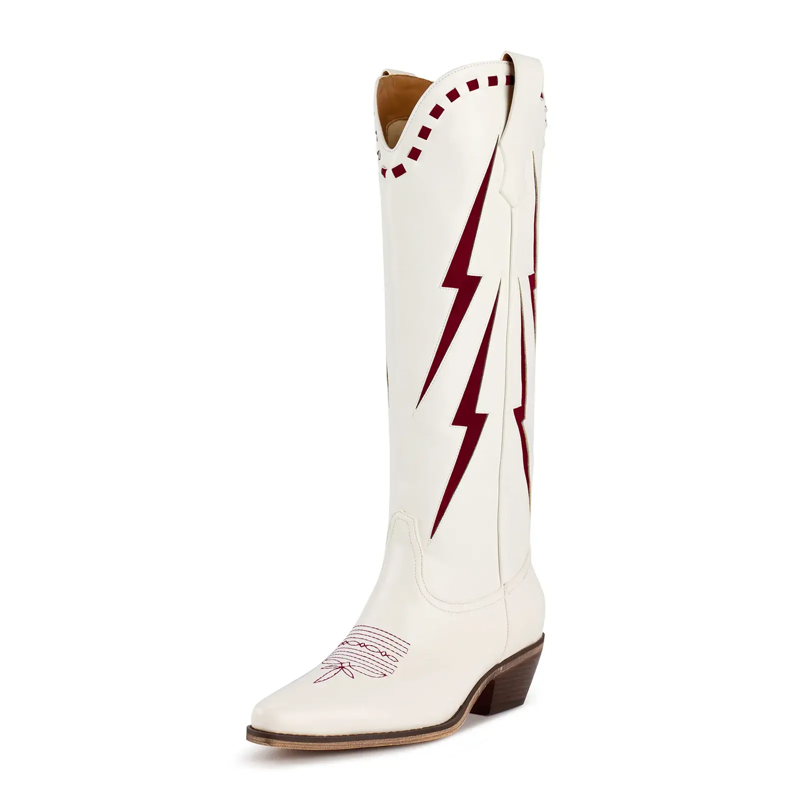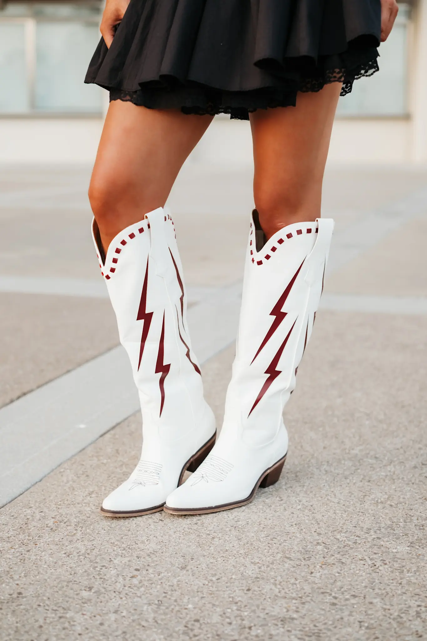 Introducing The FLASH STEP - a bold western classic with a modern edge. Crafted in crisp white with striking lightning bolt detailing down the sides, these boots are made to stand out from every angle. The mid-calf silhouette, pointed toe, and stacked heel keep the look timeless, while the graphic red strike adds instant attitude.