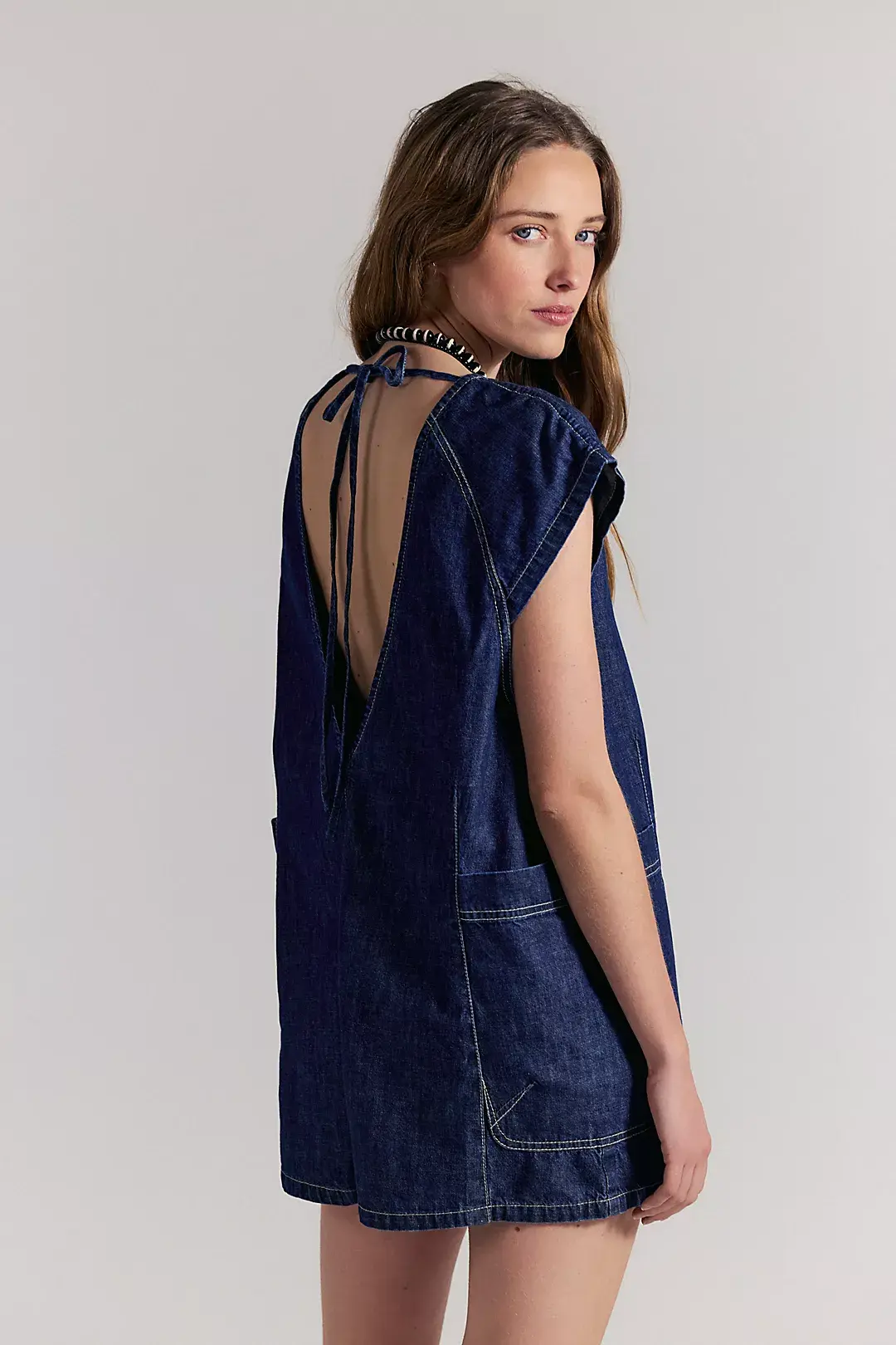 Ultra-comfortable romper, featuring an oversized fit and a shapeless silhouette with capped sleeves, wide-leg shorts, and a deep V-shaped back detail for added interest to a stunning silhouette.