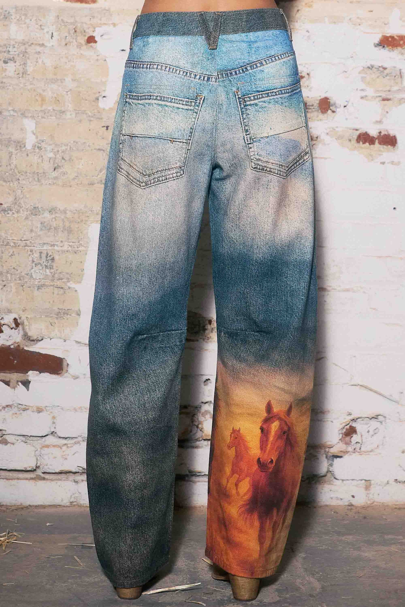 These high-rise denim pants feature a striking horse graphic design along the legs, blending vintage-inspired artistry with modern edge. The relaxed wide-leg silhouette creates a flattering, elongated look while offering all-day comfort. A soft faded wash gives them that perfectly worn-in, effortless vibe.