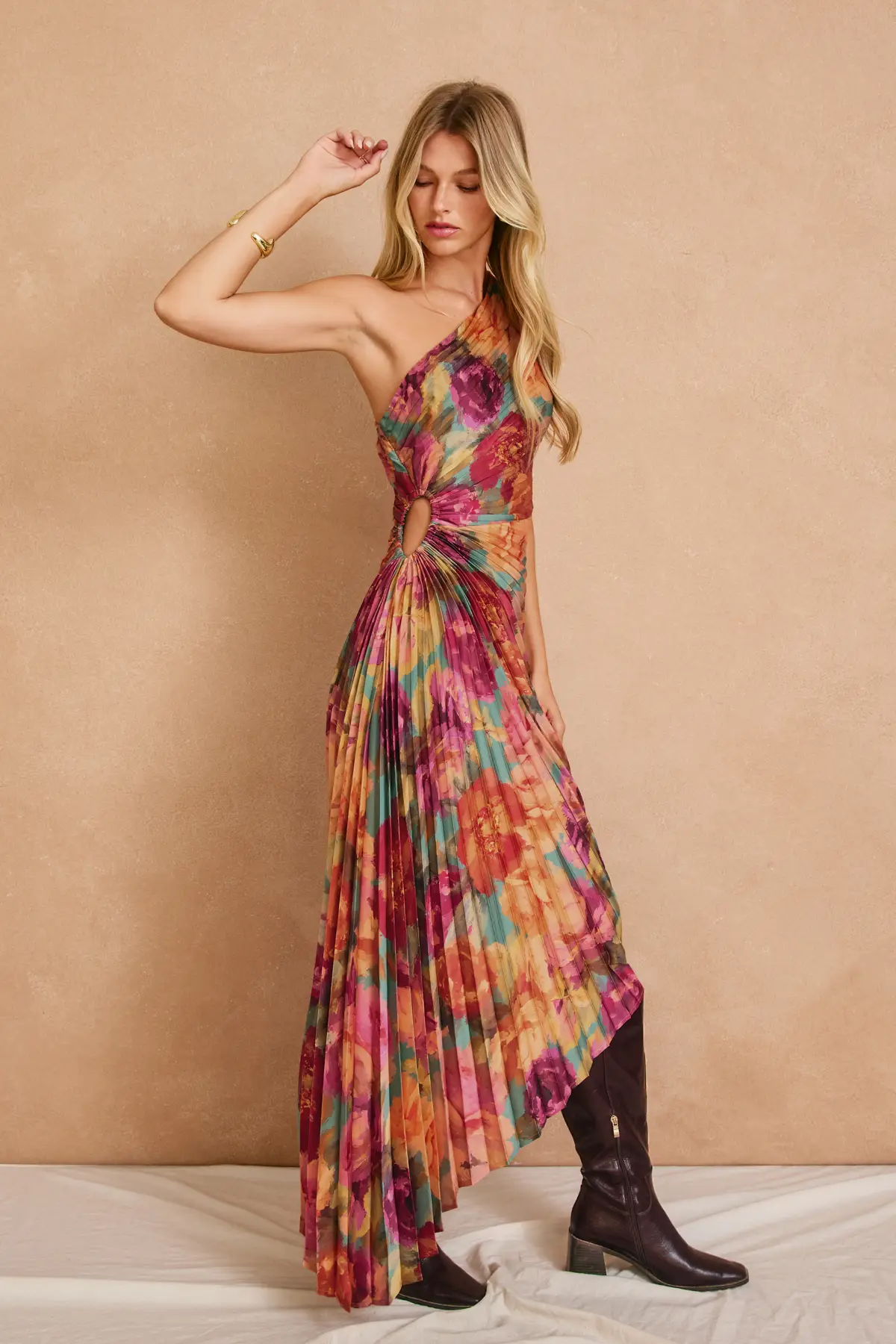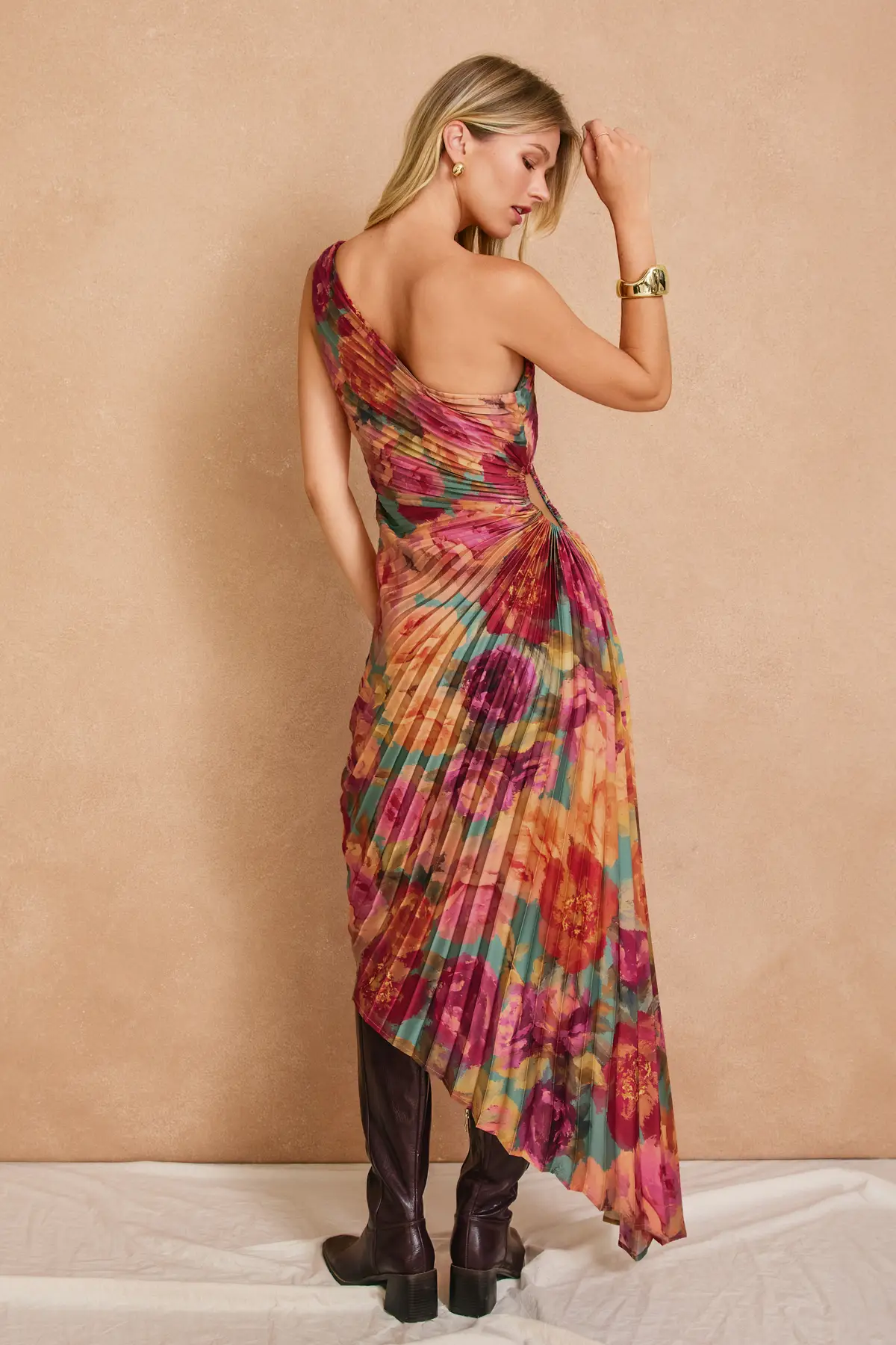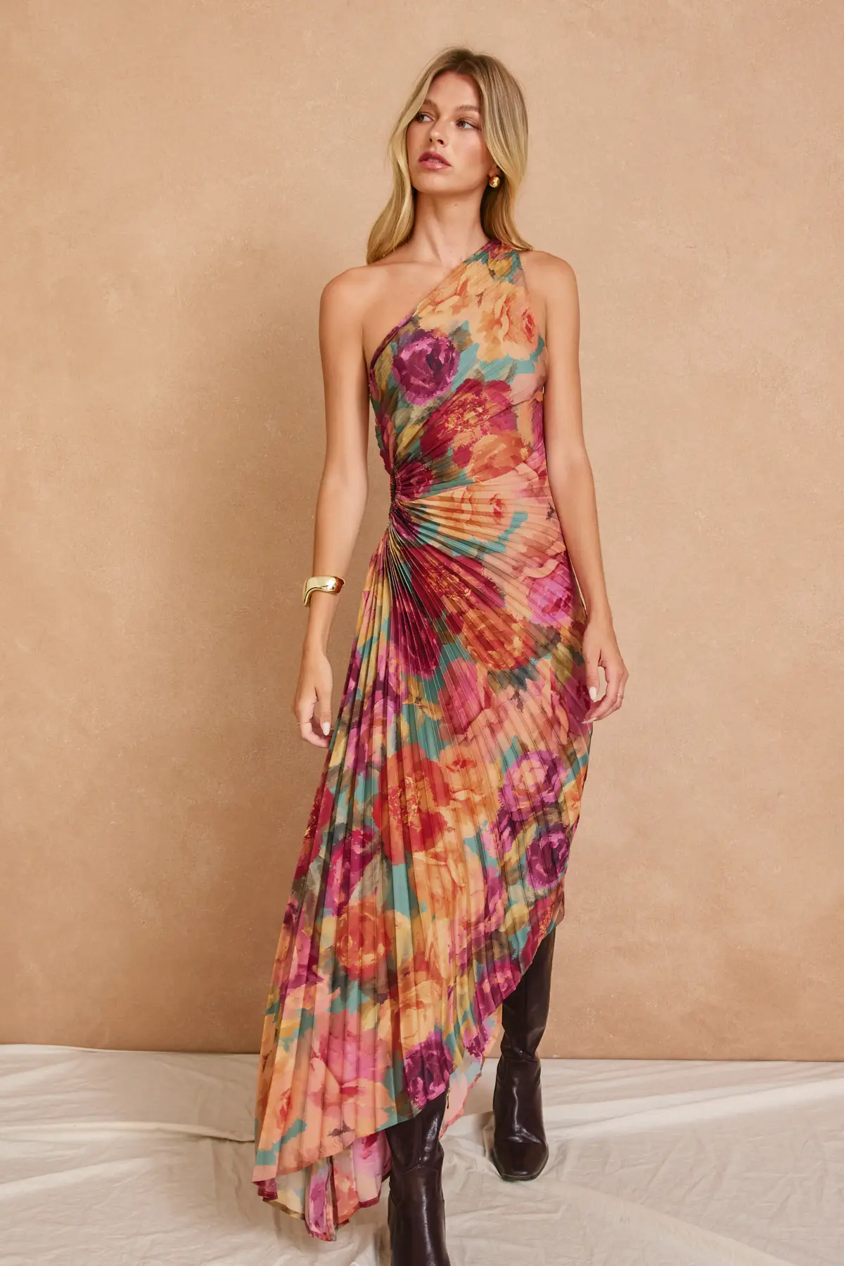 The Garden Asymmetrical Pleated Maxi Dress is a statement in graceful femininity. Featuring soft pleats that move beautifully and an asymmetrical neckline and hem that adds just the right amount of drama. It's the perfect blend of romantic and refined, made for special moments and standout nights.