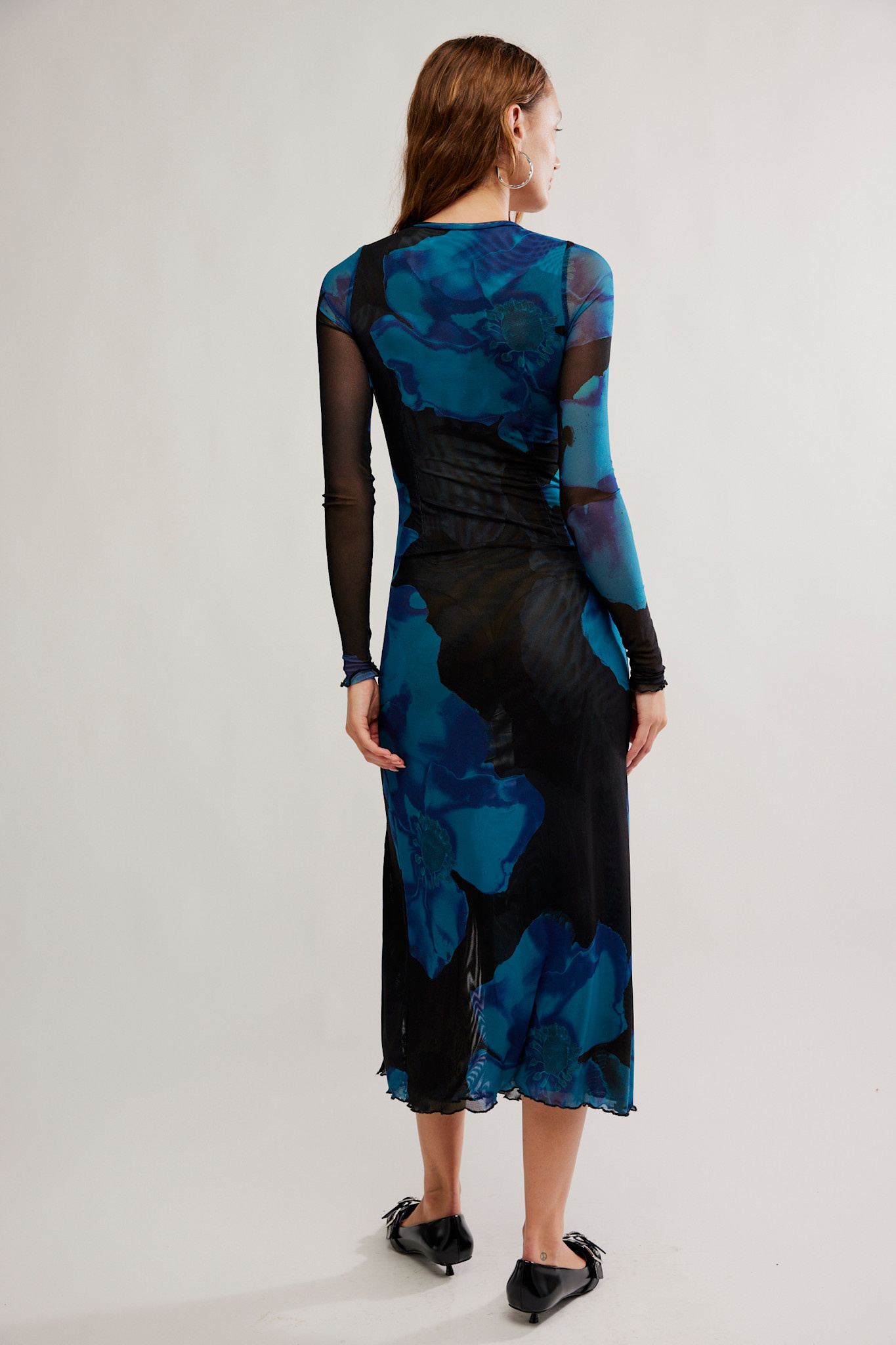 This maxi features a printed mesh fabrication and long-sleeve silhouette with gathered waist detailing and an exaggerated slit.