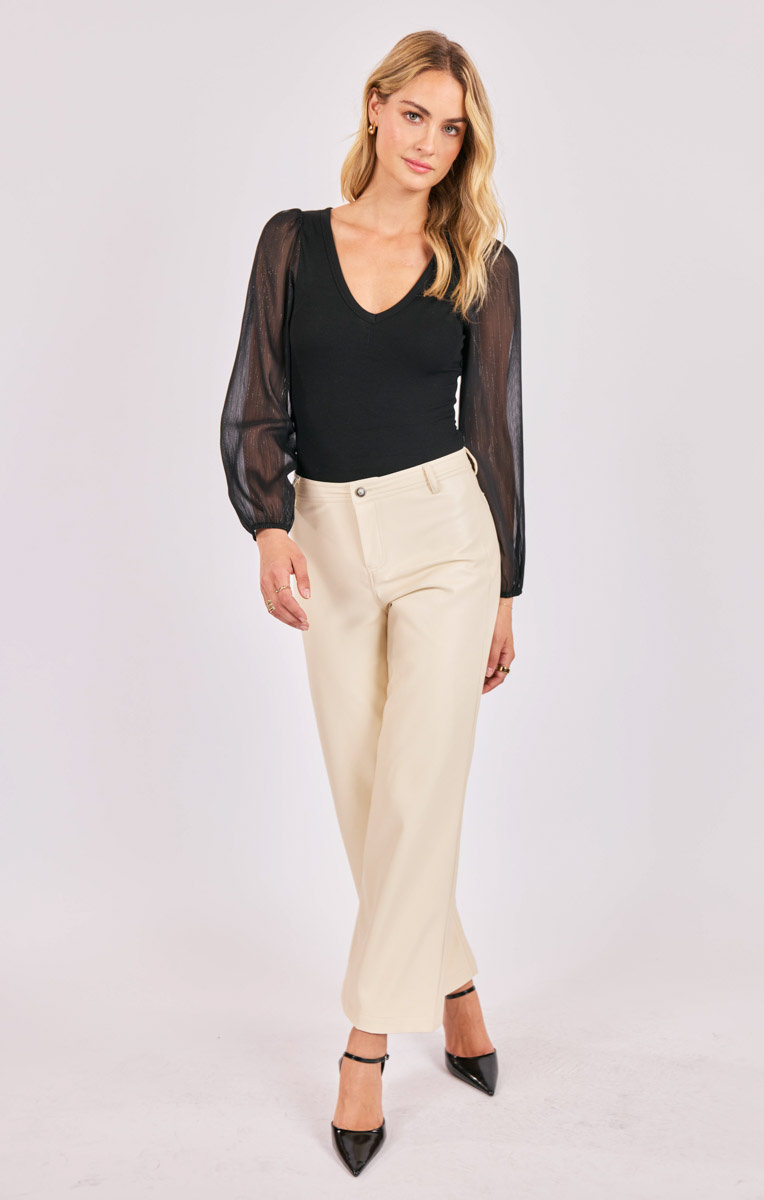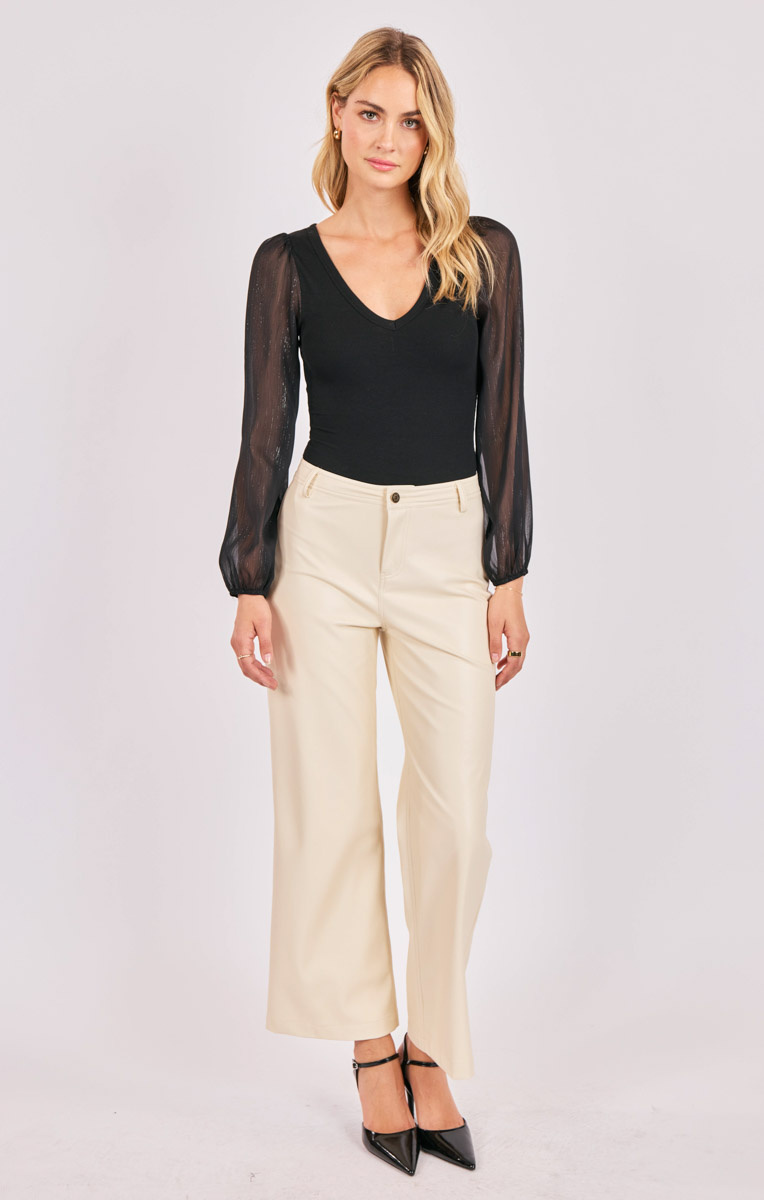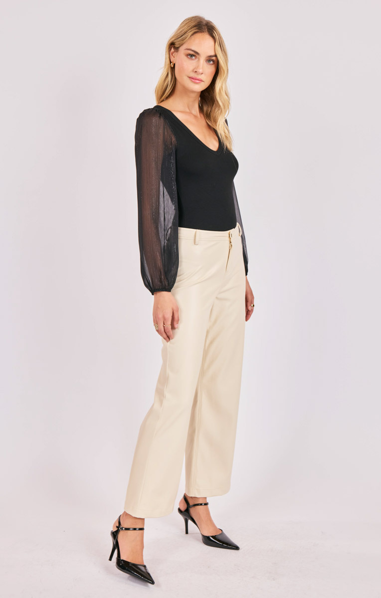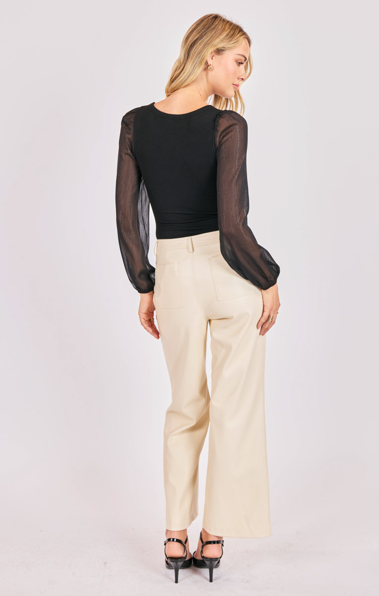 The Gleam Mixed Media Bodysuit stuns with its fitted silhouette and sheer long sleeves that add just the right touch of allure. Perfect for dressing up denim or layering under blazers, it's a timeless piece that balances sophistication with a hint of edge.