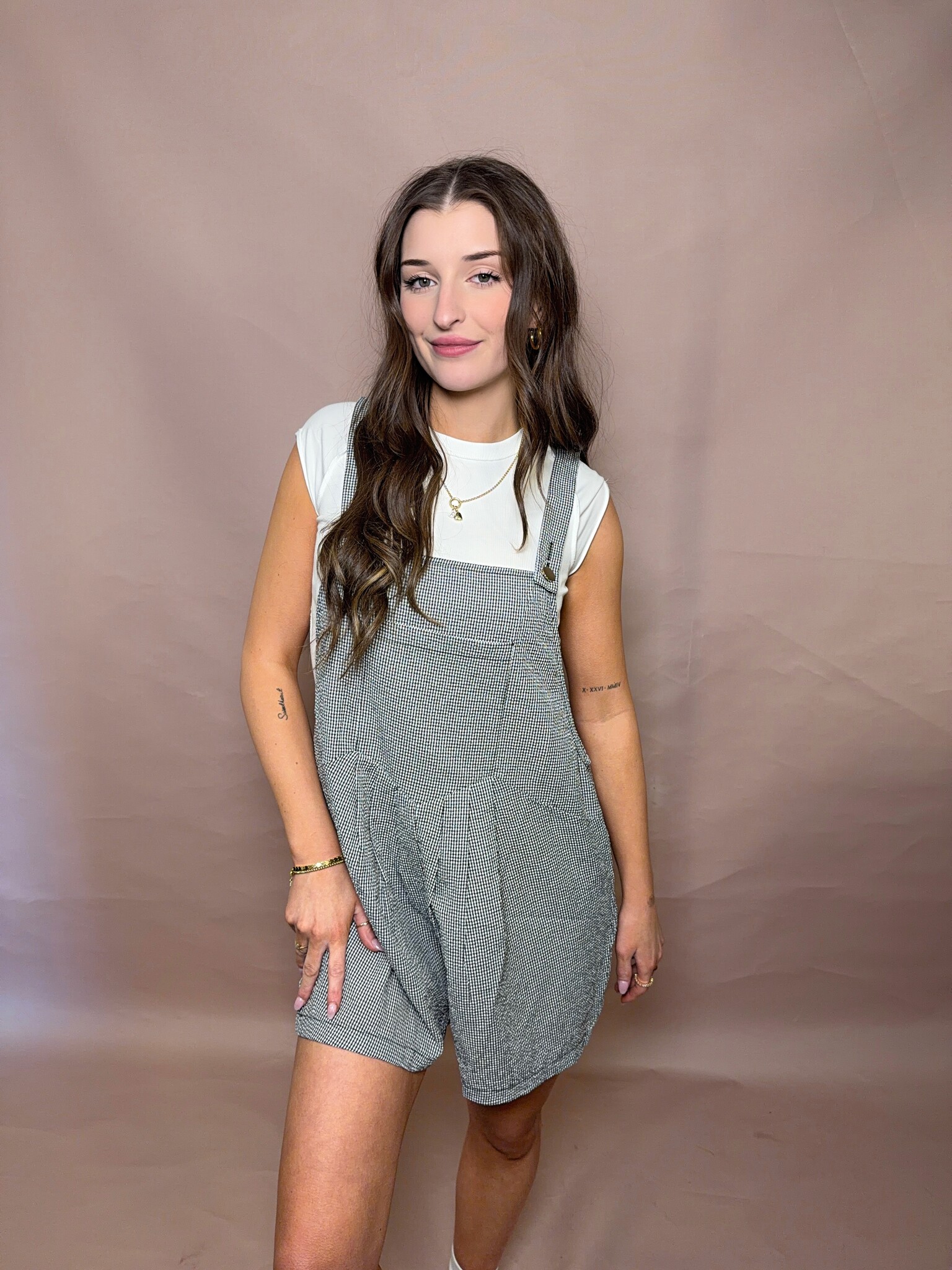 The Goldie Short-All is your new go-to for warm-weather style. Crafted in a classic black gingham print, this short-all features a relaxed fit with adjustable straps for comfort and versatility. Perfect for casual days, brunches, or weekend adventures, it pairs easily with tees, blouses, or layered over a lightweight sweater.