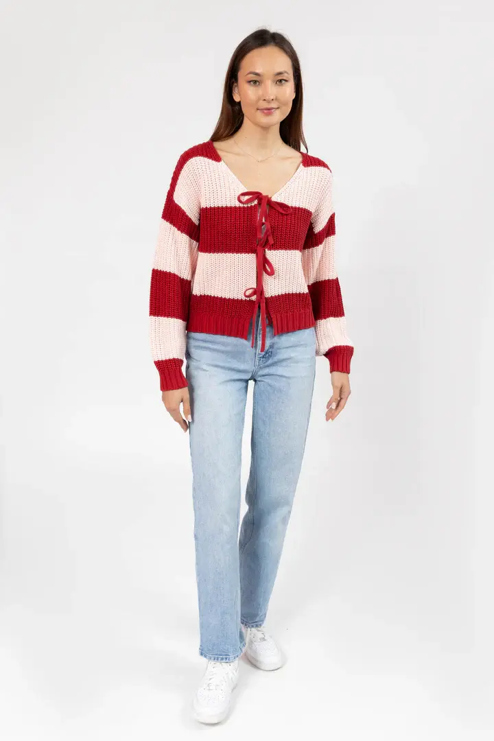 The Gracie Bow Tie Cardigan combines two trends, stripes and bows, into one feminine silhouette. Made in a chunky soft, cotton yarn, this stylish cardigan features a three-tie closure at the front, contrast striped detail, and a relaxed fit. Look and feel your best all day long in a style that’s tested and proven to do the job!