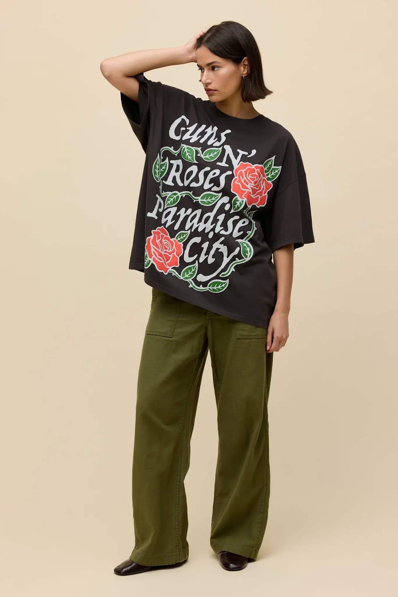 Soaring the charts and gaining such popularity that it became the band's show-closing song during three iconic tours. Thought up in the back of a rental van, it was just a few drinks and jokes that turned random hums, a couple rhymes and knee jerk lyrics into their smash hit. Represented in oversized text and rose vines on this double-sided OS Tee
