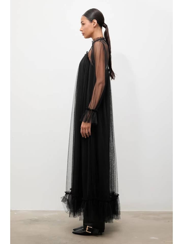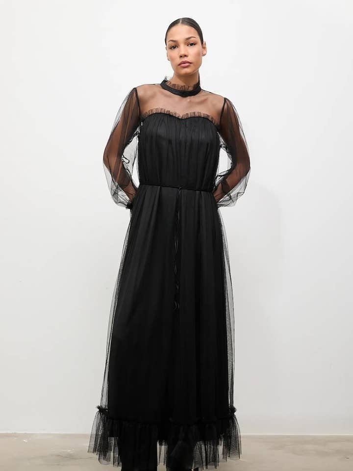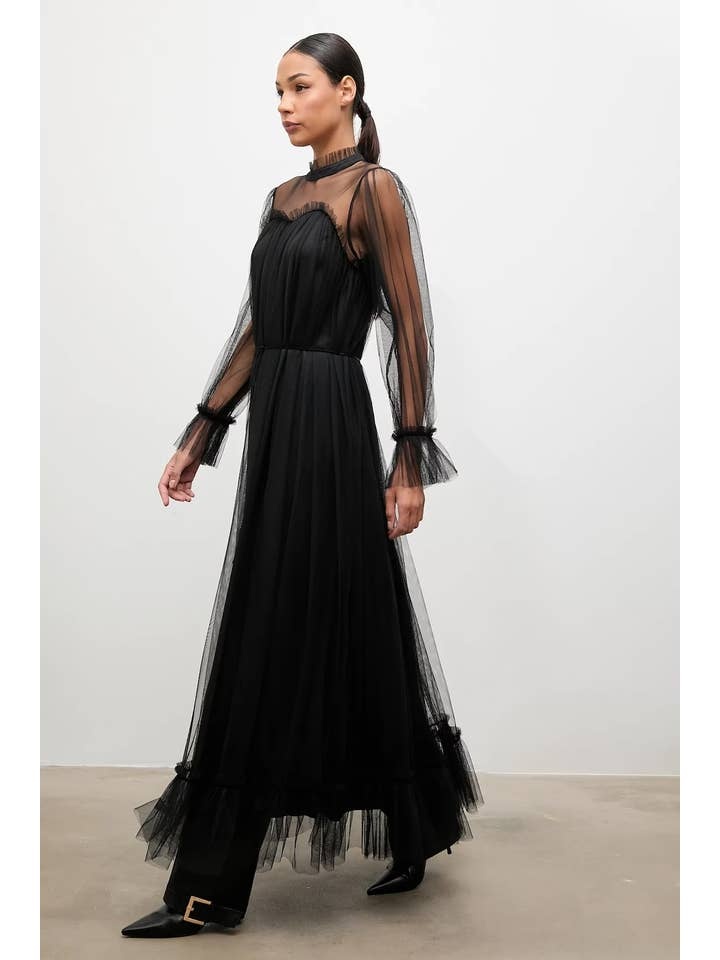 This captivating black gown features sheer tulle layers that float effortlessly with every step, while delicate ruffle accents at the cuffs, collar, and hem add just the right amount of drama!