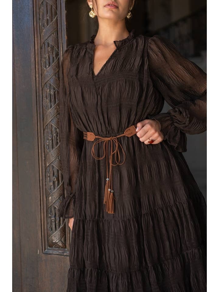 This long dress stands out with its ruched fabric for a glamorous look. This dress with its incredible charm stands on its own and can be worn with a belt and boots or heels.