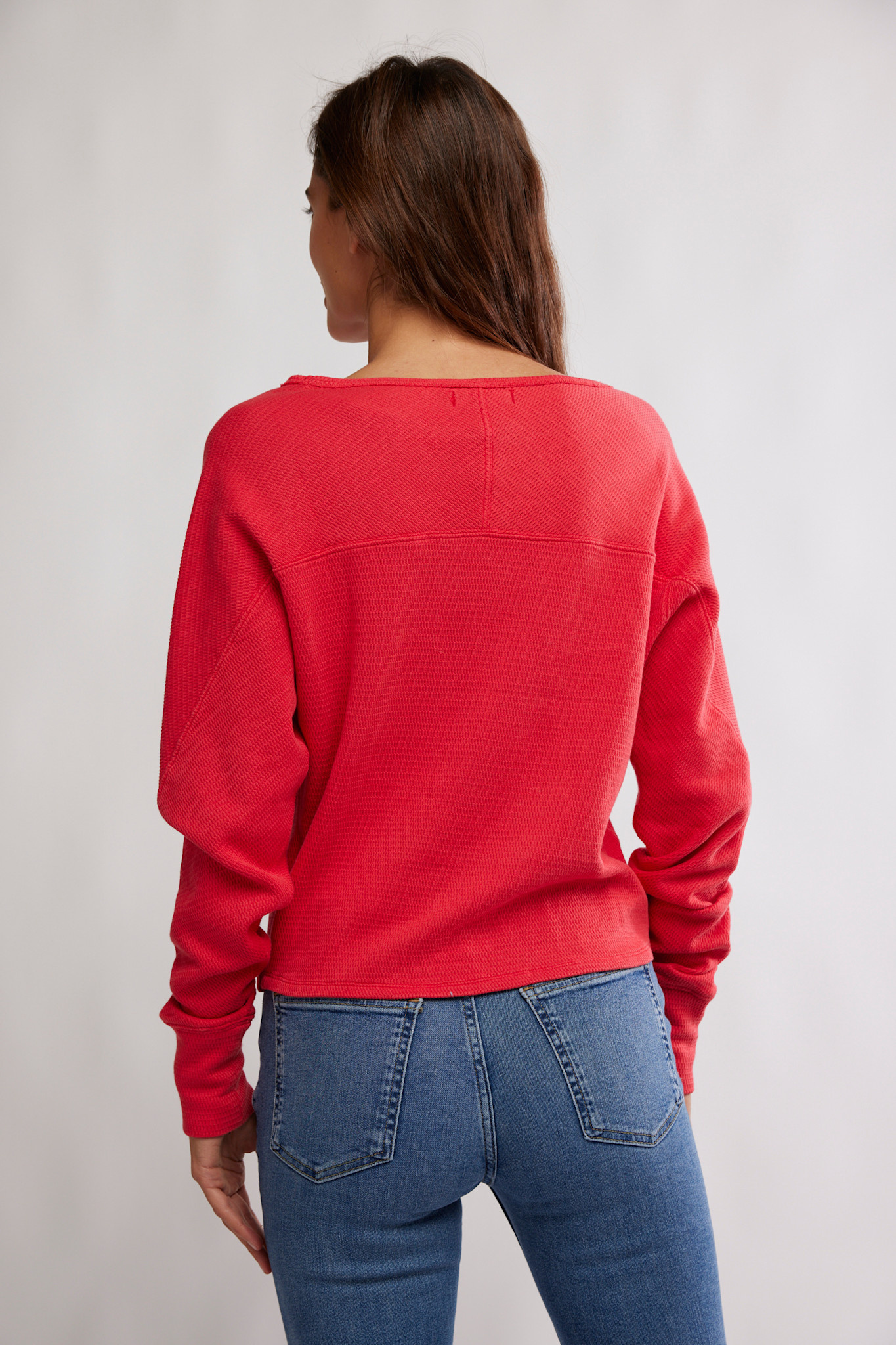 This long sleeve from featured in a thermal fabrication with a flattering boat neckline and slouchy dolman sleeves.