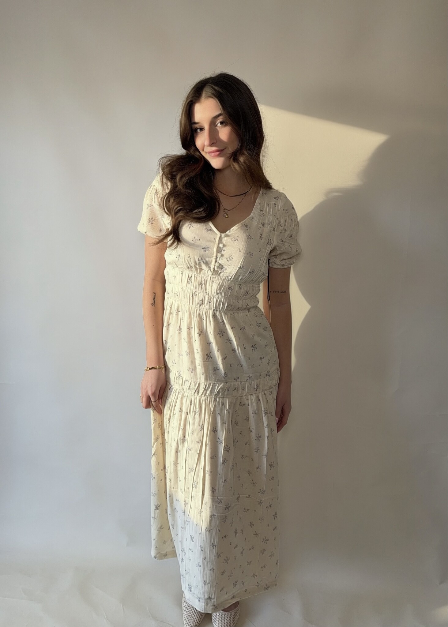 The Josie Maxi Dress features a dainty floral print, flattering smocked details and a graceful V Neck. With its flowing silhouette and feminine charm, it's the perfect piece for sunlit days and dreamy evenings.