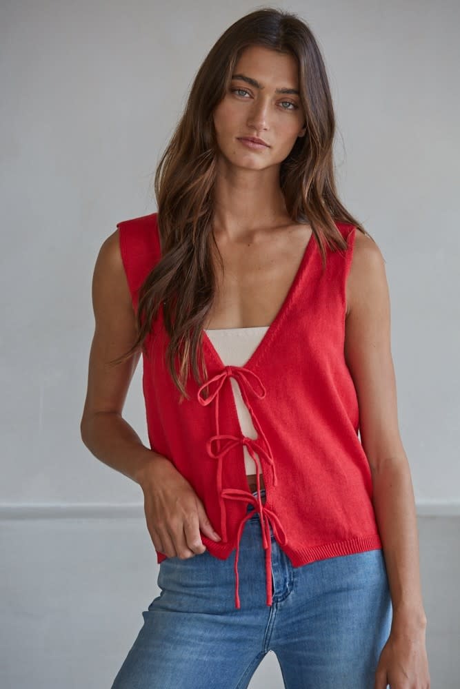Crafted from a breathable ramie-cotton blend for lightweight comfort. Designed with a ribbed texture for a flattering fit, it features a classic V-neckline and an adjustable tie-front detail that adds a feminine touch. Easy to style and endlessly versatile, this vest can be worn on its own or layered for a polished yet effortless look.