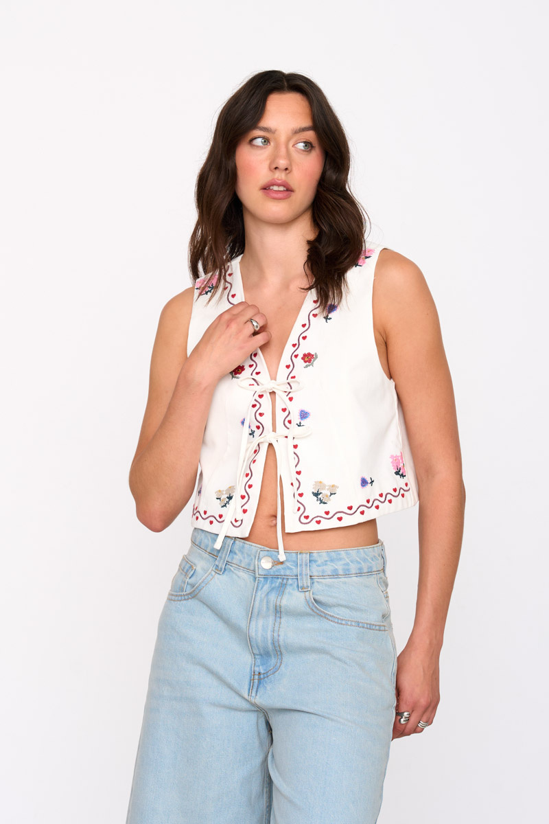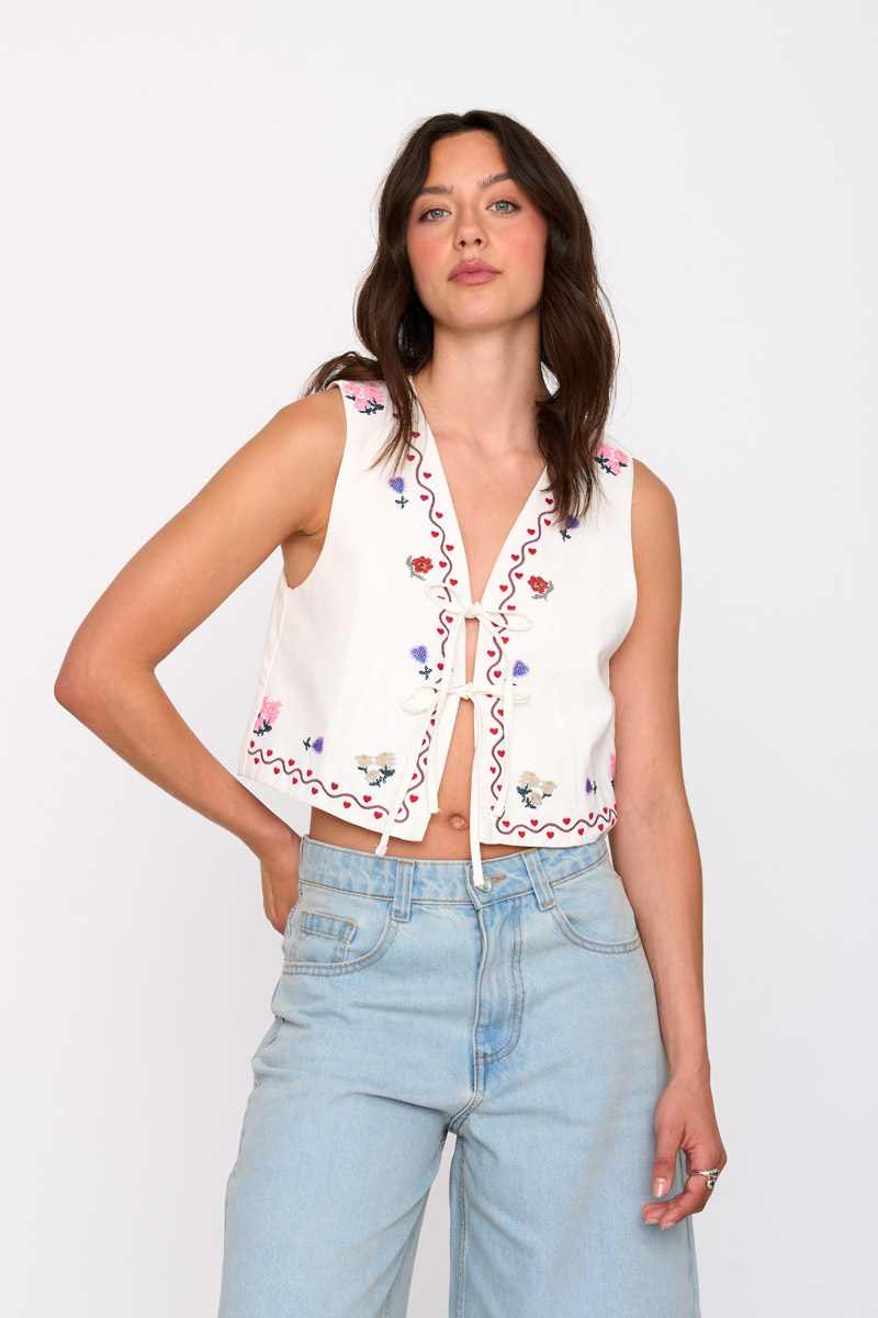 This white vest is the perfect layering piece to elevate your everyday look. Designed with intricate floral embroidery, it brings a soft vintage-inspired feel while still feeling fresh and modern.