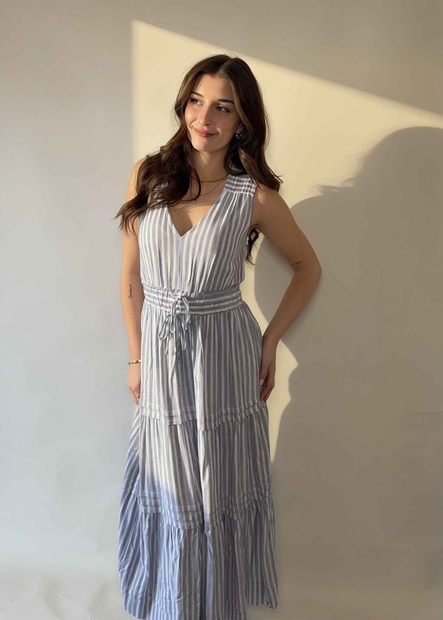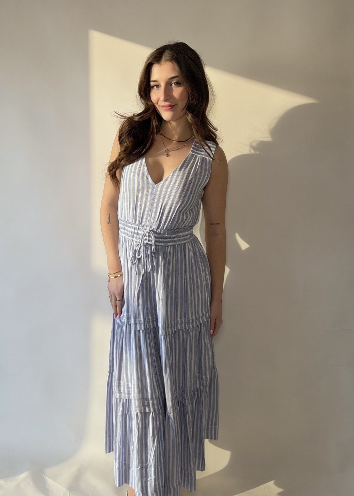 The Kinsley Maxi Dress features a beautifully tiered skirt and a flattering tie waist that defines your silhouette. Light, breezy and effortlessly chic, it's the perfect piece for warm days when you want comfort with a touch of polished charm.