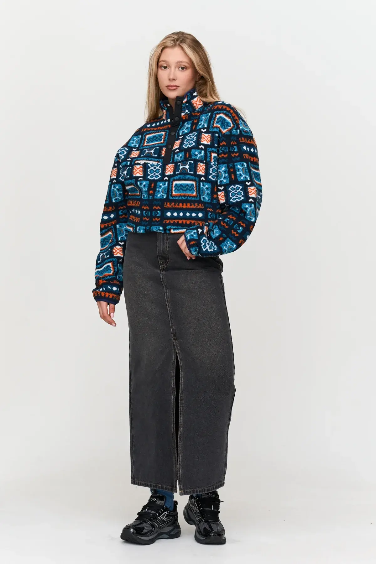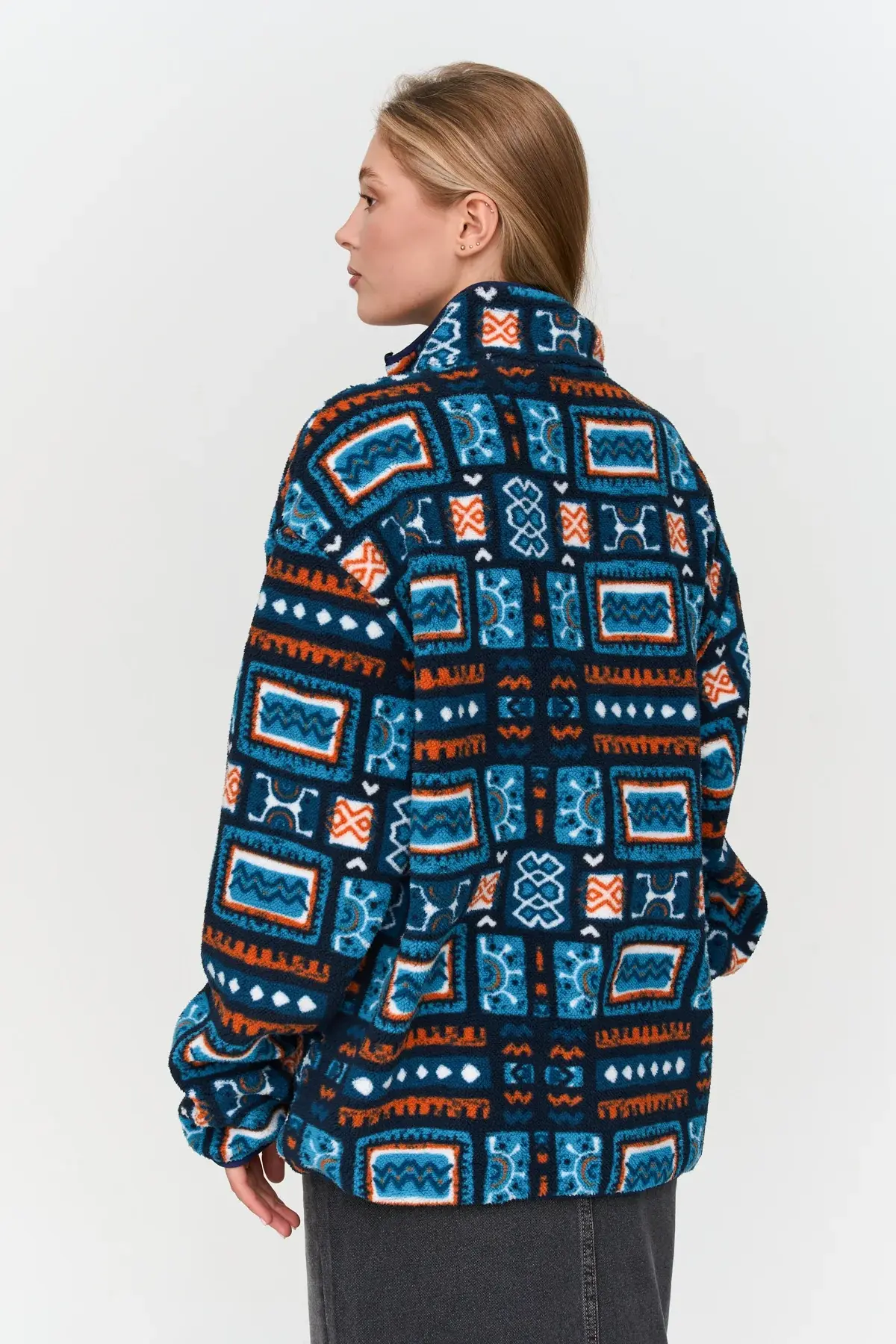 Where warmth meets statement-making design. Featuring a vibrant geometric print in deep navy, icy blue, and warm orange tones, this ultra-soft fleece brings retro vibes with a modern twist. The high neck with snap-button closure keeps you snug, while the relaxed fit and plush fabric make it perfect for chilly days, outdoor adventures, or laid-back lounging.