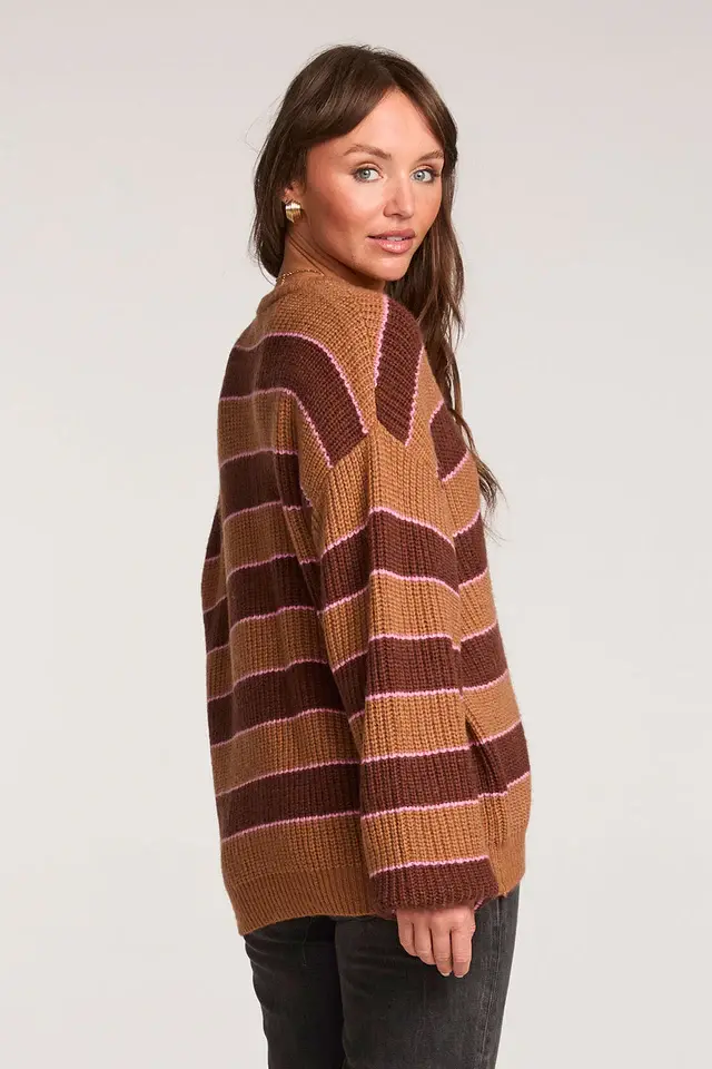 The Leilani Chai Sweater features wide stripes in tonal shades of browns. Its open neckline and waist-length cut create a polished, preppy chic look perfect for effortless sophistication.