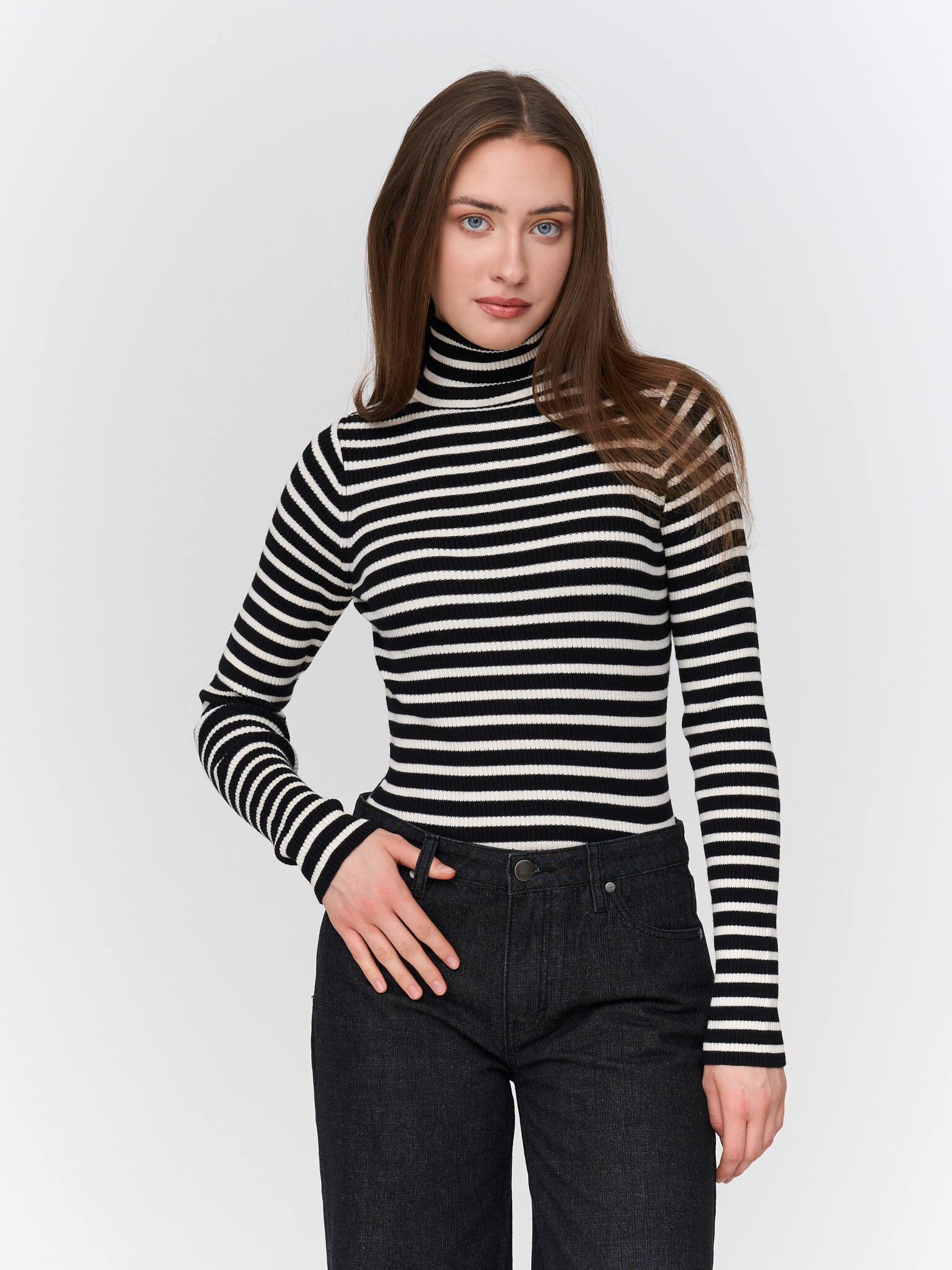 Featuring a flattering fitted silhouette, this black and white striped long sleeve is a must-have for layering or wearing solo. The soft, stretchy ribbed knit hugs in all the right places, while the mock neck adds a touch of classic sophistication. Perfect for pairing with jeans, skirts, or layering under jackets and vests, this versatile piece transitions seamlessly from day to night and season to season.