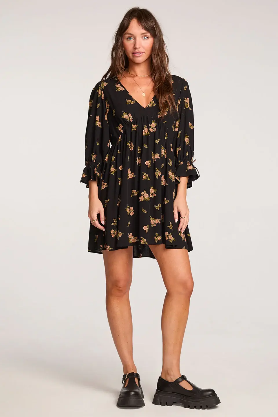 The Marris Mini Dress features a dark botanical print and a roomy fit for comfortable elegance.