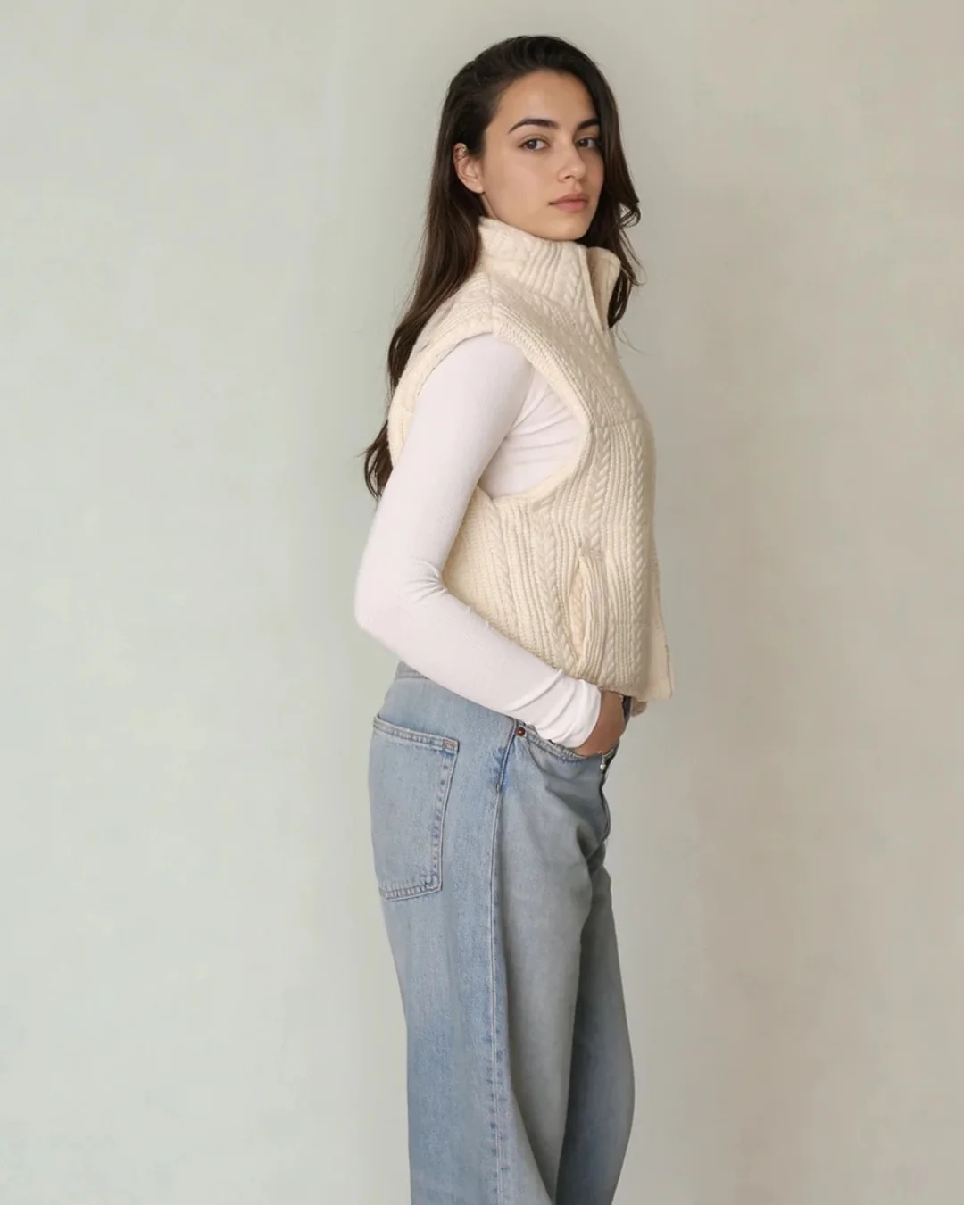 This women’s cable-knit bomber vest combines vintage-inspired texture with streetwear edge. The chunky cable-knit exterior brings cozy vibes, while the bomber-style cut keeps it modern and flattering. Throw it over your favorite tee or button-up for that effortlessly chic, off-duty feel.