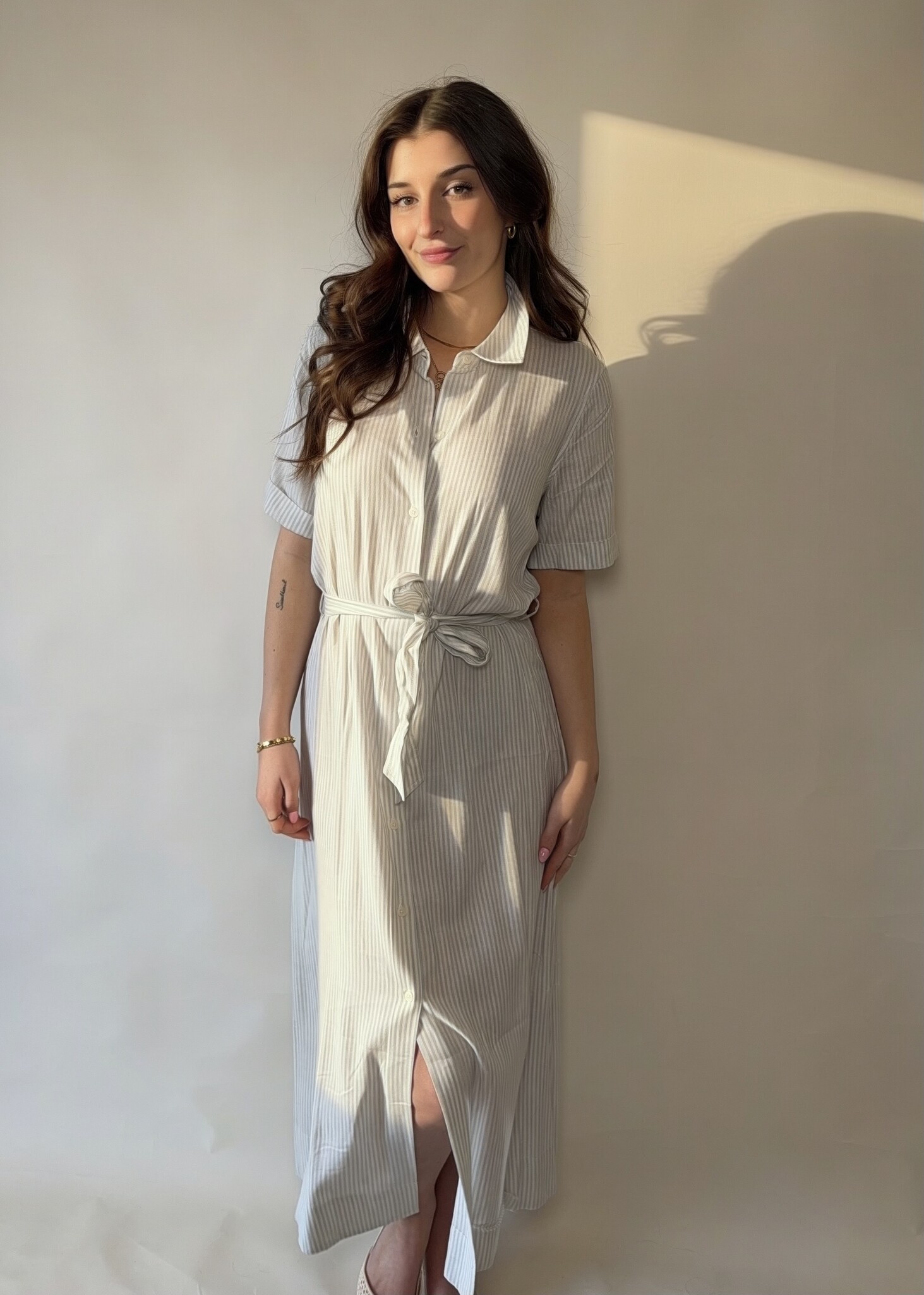 The Millie Shirt Dress features a timeless button front closure and a clean, tailored silhouette. Easy to dress up or down, it's the perfect blend of structured style and relaxed elegance for everyday wear.