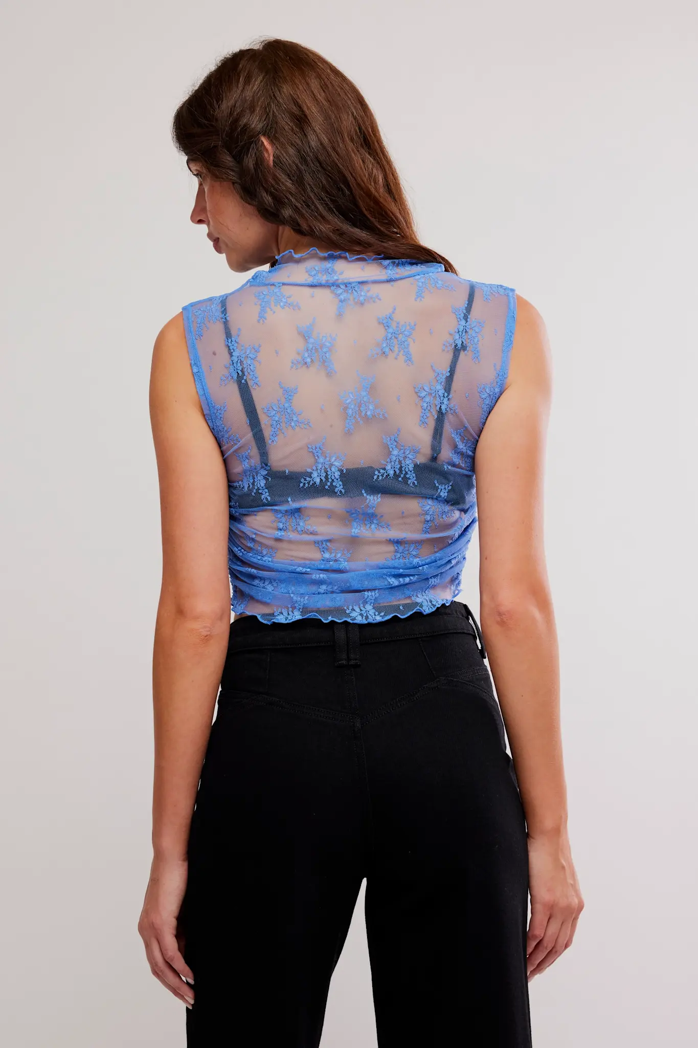 This muscle-style tank features femme floral embroidery throughout with ruffled high neckline and ruched seaming at the sides for added shape.