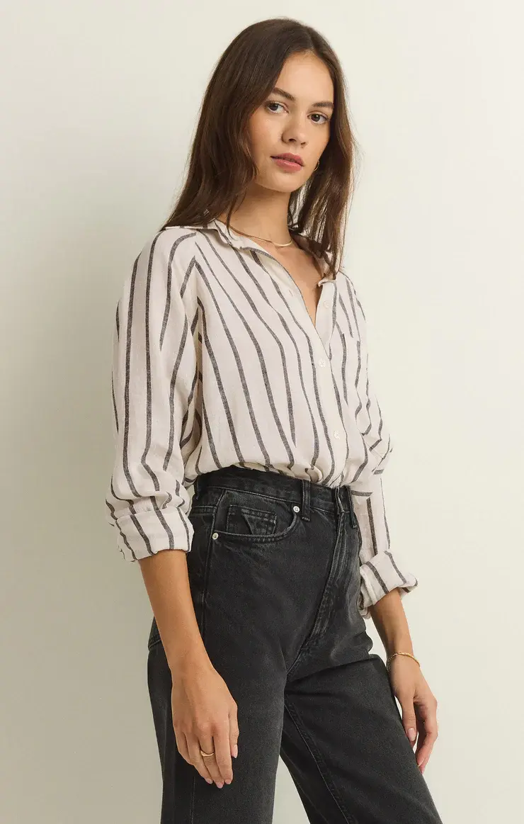 You'll love the easy, breezy comfort of this classic stripe button-up!