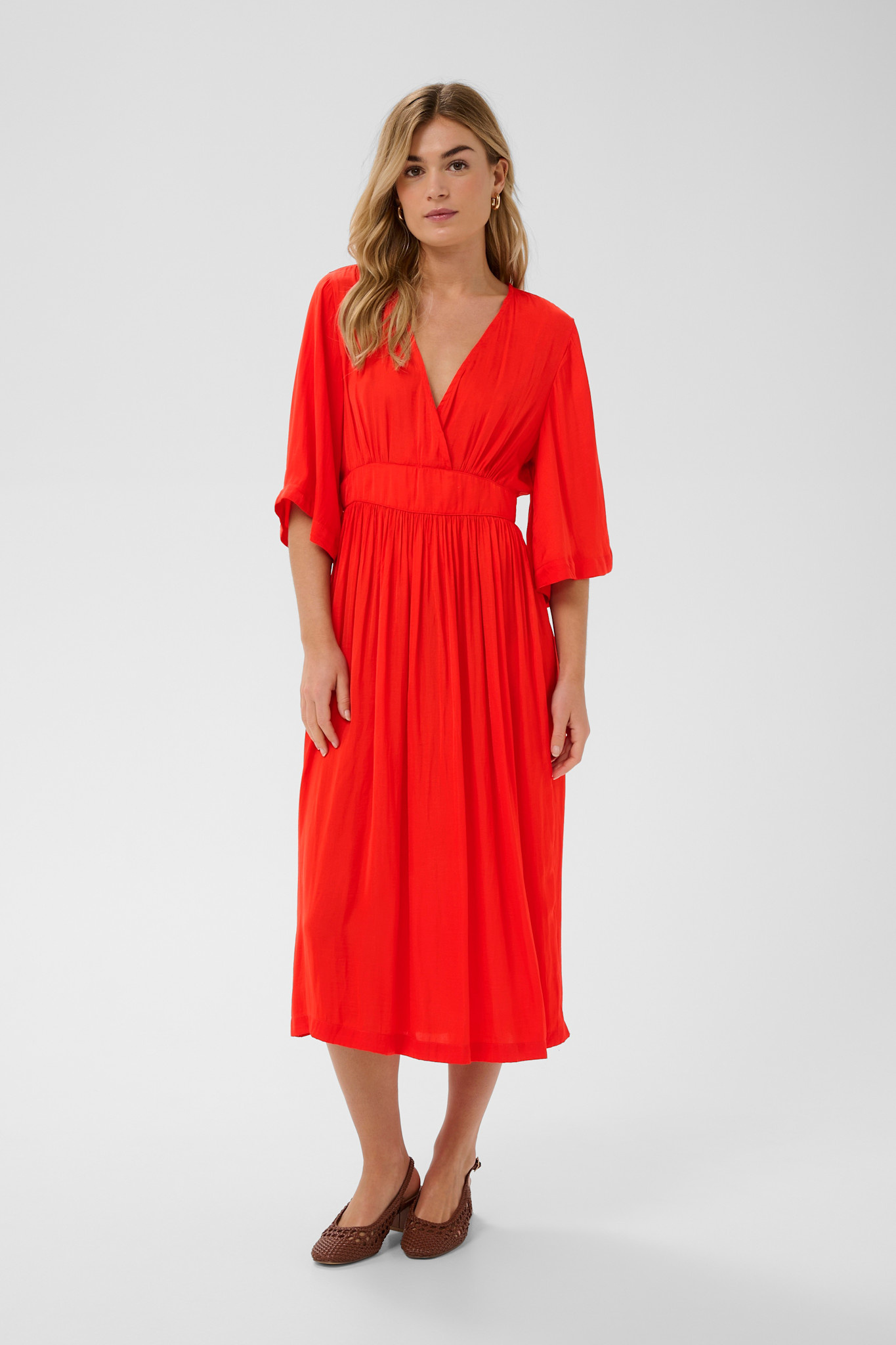 Designed with a flattering empire waist and flowing pleated skirt, it creates a beautifully feminine silhouette while keeping you comfortable all day long. The lightweight fabric drapes softly, and the V-neckline adds just the right amount of elegance. Whether you're heading to brunch, a summer event, or an evening out, this dress brings easy sophistication with a bold pop of color.