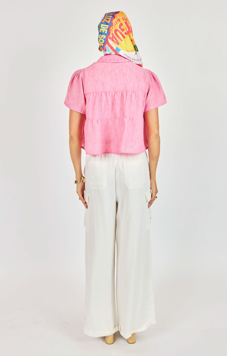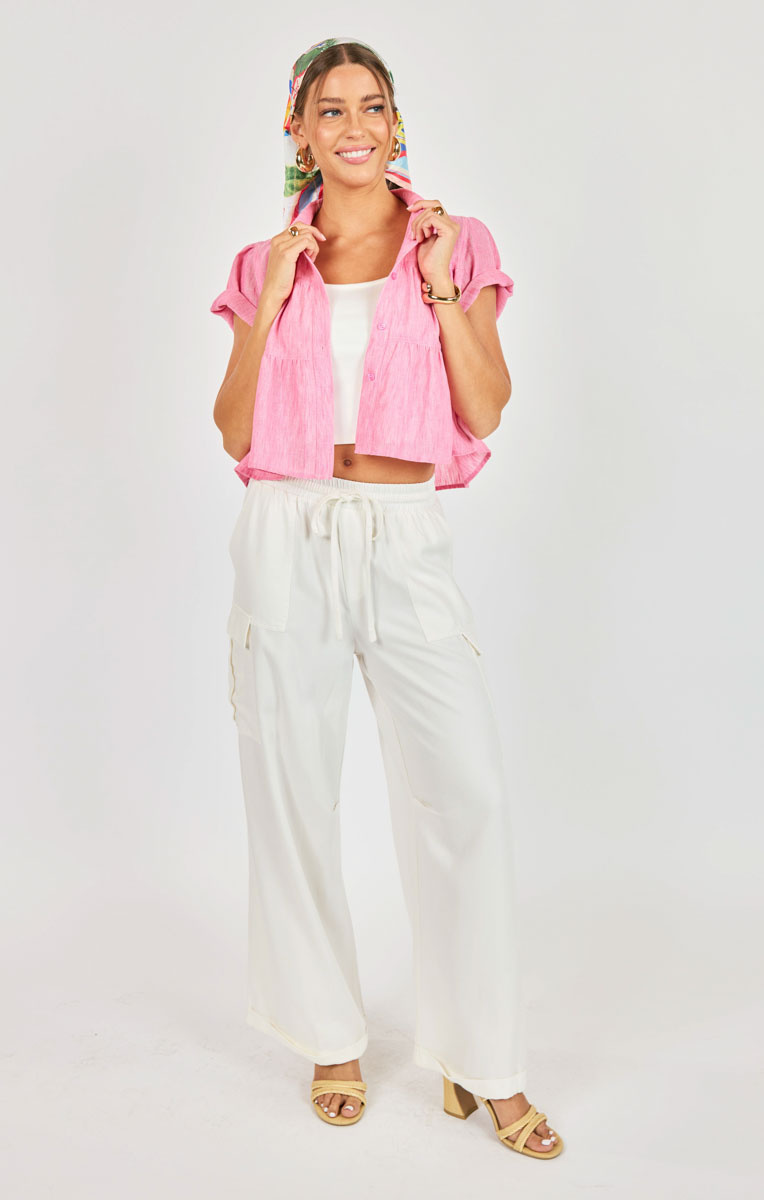 This chic button-up top features a lightweight textured fabric and a flattering babydoll silhouette for an effortless, feminine look. Designed with soft gathered details and a cropped length, it pairs perfectly with high-waisted jeans, skirts, or wide-leg pants for a fresh and stylish outfit.