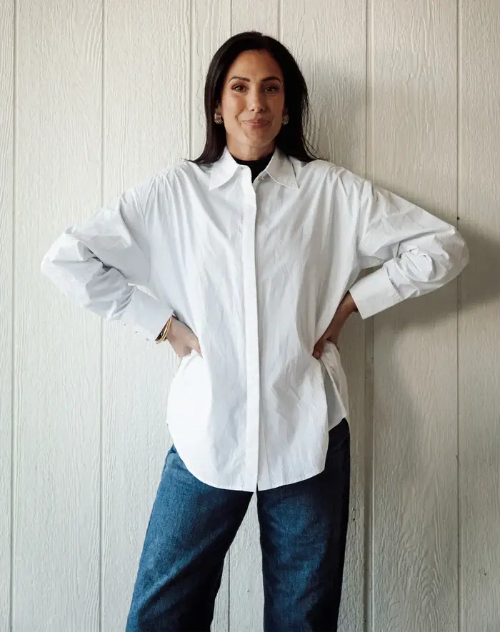 Our Button Up is dress-shirt inspired with a front placket and hidden buttons, finished with the cutest little bow detail on the top button and a row of bow buttons along the cuffs. A box pleat at the back adds just the right amount of shape. Made from 100% cotton in a relaxed fit.