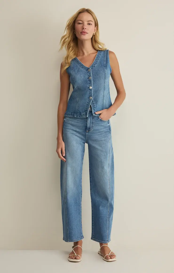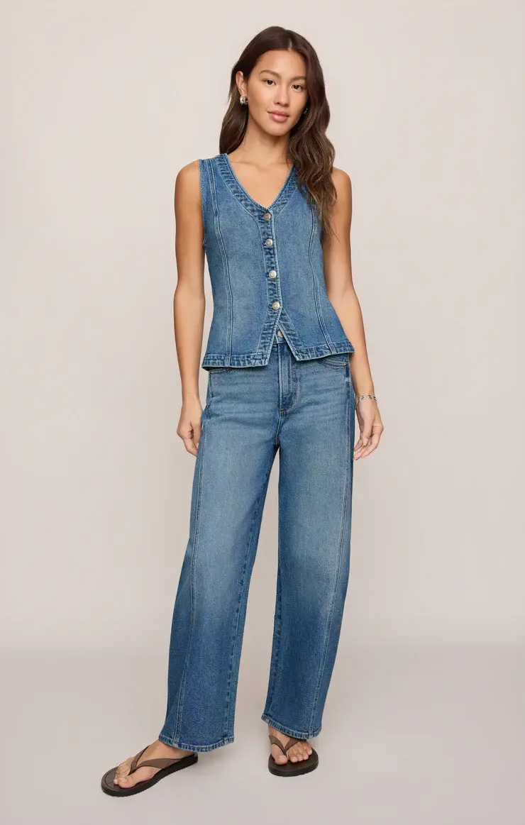 A nod to classic denim craftsmanship, this tailored denim vest is designed with a flattering v-neck. Pair this sleeveless vest with matching jeans for an effortless double-denim look rooted in timeless style.