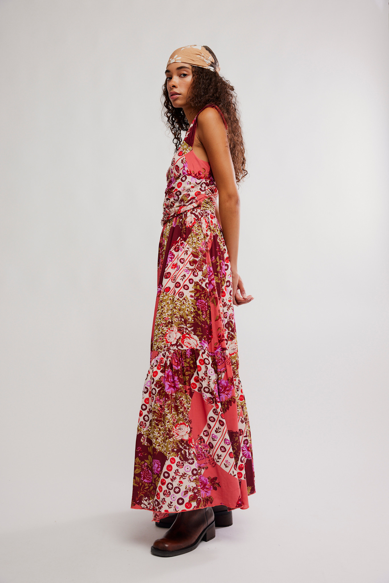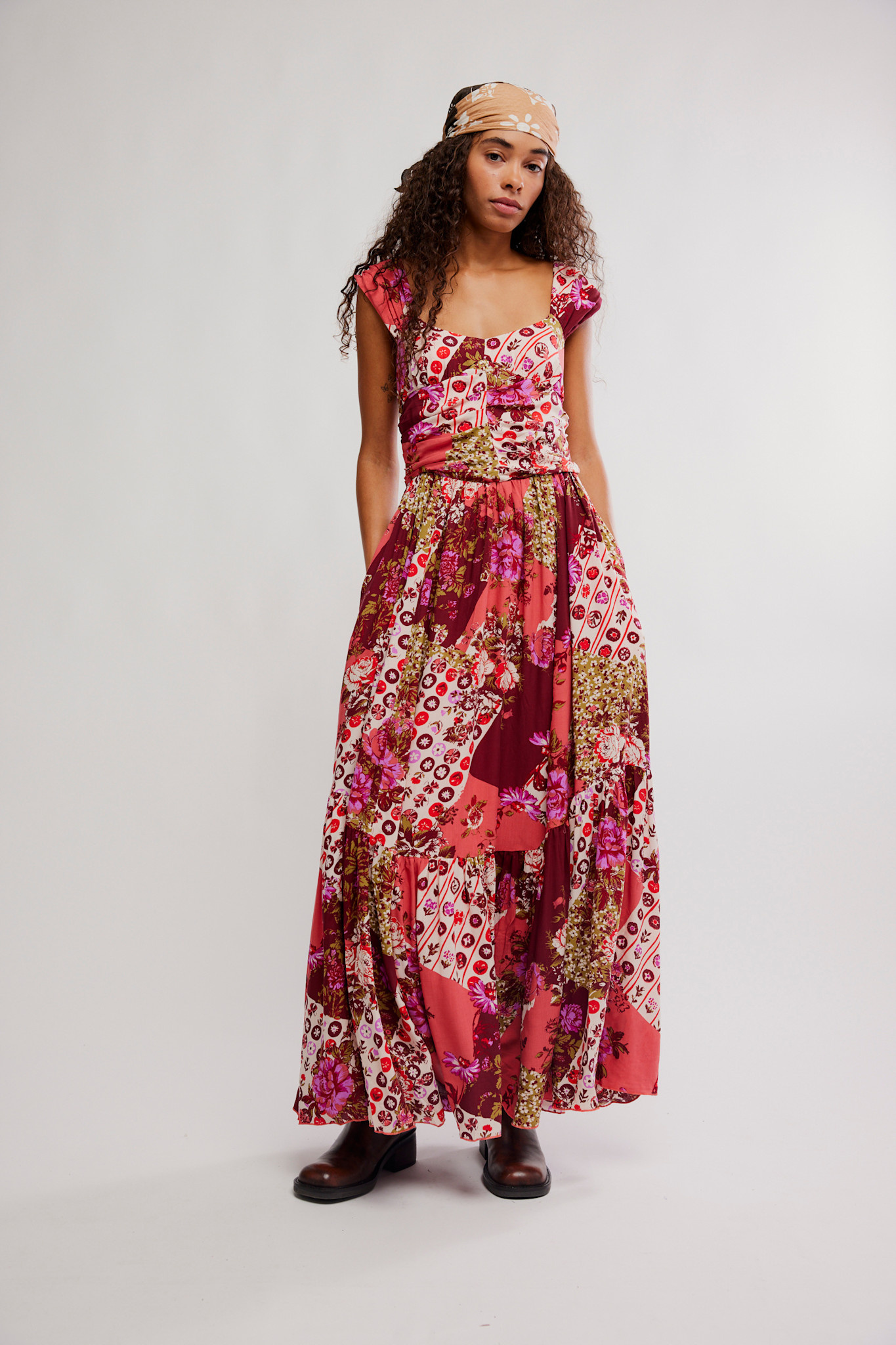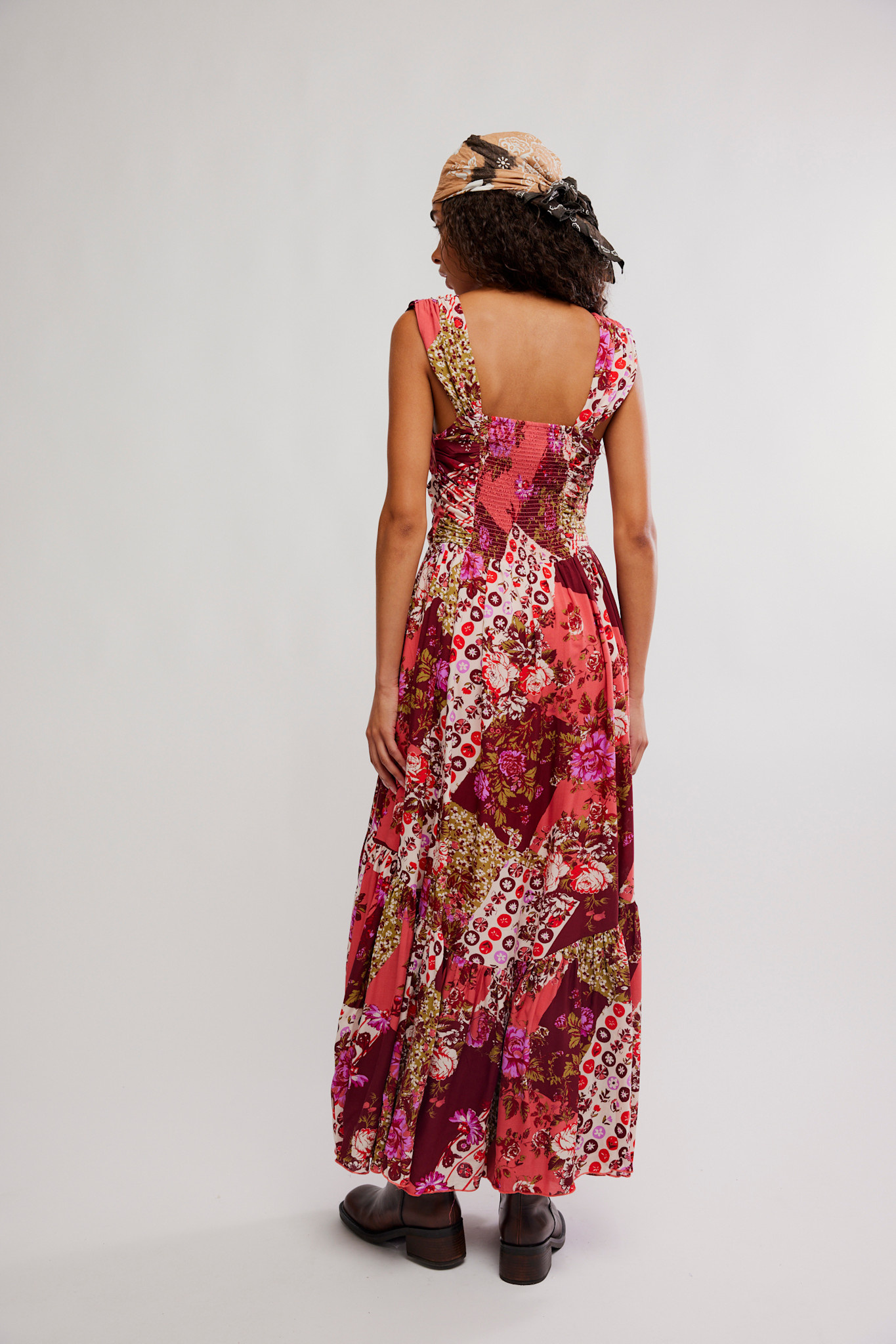 Featuring a vibrant patchwork floral print in warm red, pink, and cream tones, the dress creates a striking yet effortless look. The fitted bodice with a square neckline enhances the silhouette, while the flowing tiered skirt adds graceful movement.