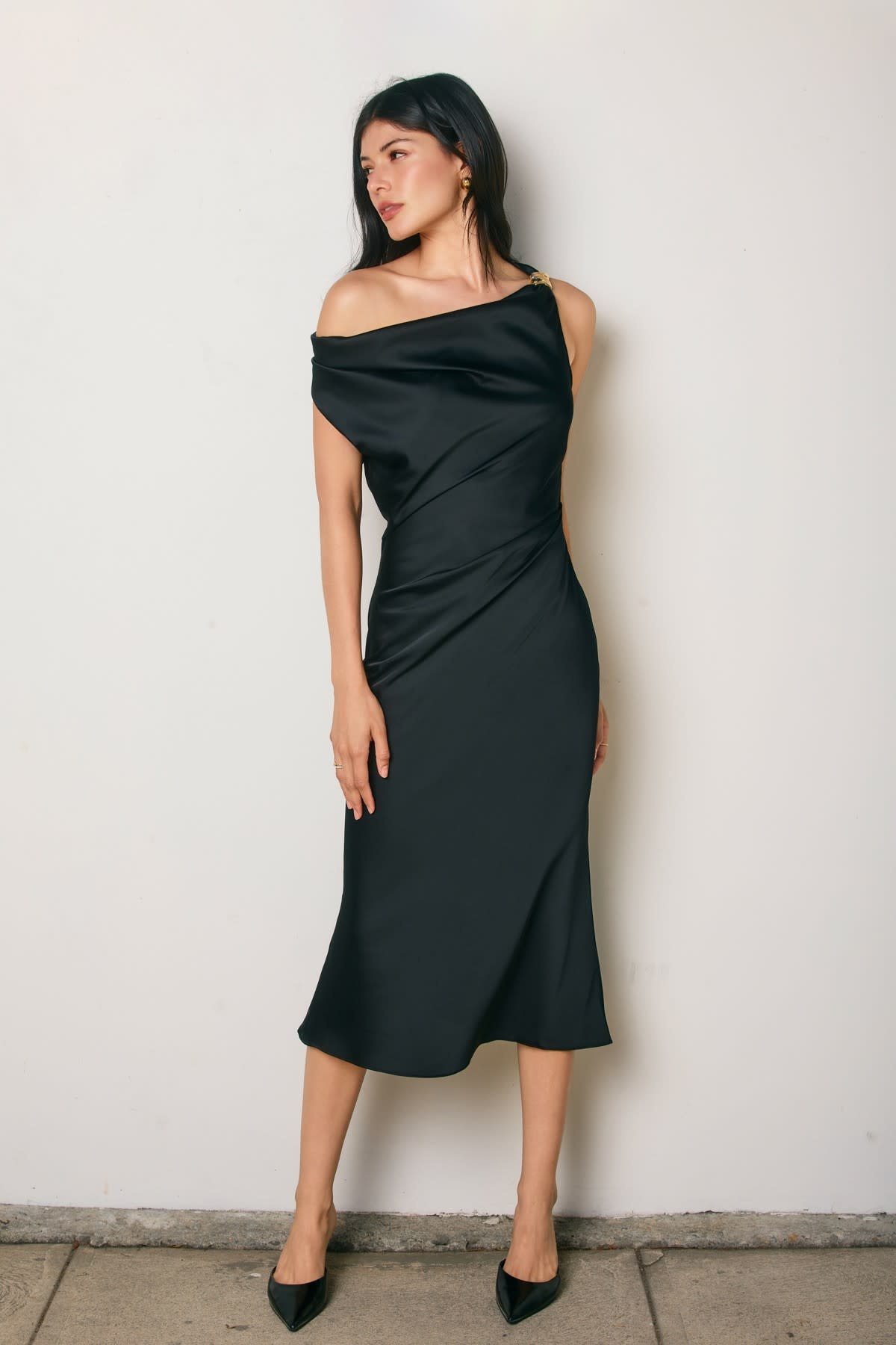 The Shelley Satin Off the Shoulder Midi Dress drapes beautifully with a soft, luminous finish. The exposed neckline adds a romantic touch while the midi length keeps it timeless and refined. Perfect for evenings when understated glamour speaks volumes.
