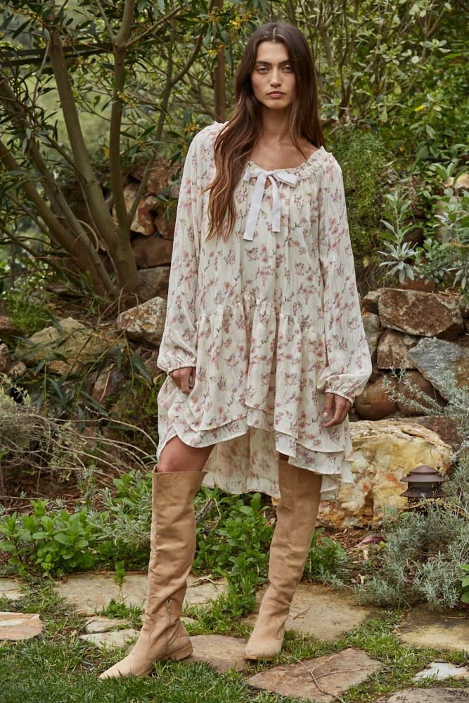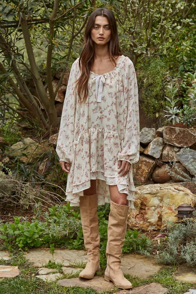 Designed to make every moment feel special. Crafted from lightweight woven polyester, it features a flattering scoop neckline with a front tie strap and a subtle V-neck slit detail for a touch of allure. Long sleeves balance the playful mini length, while the layered flare skirt adds beautiful movement. Finished with a soft rayon lining for comfort, this dress is perfect for brunch dates, weekend outings, or special daytime occasions.