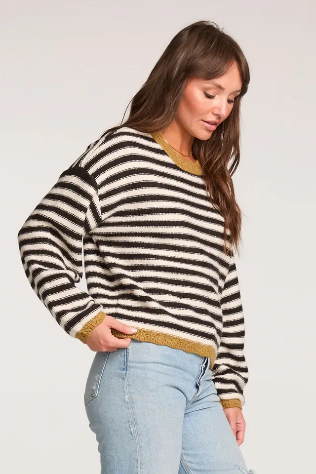 Its cropped body is accented with brown detailing at the neckline, hem, and sleeves, delivering a timeless and refined look.