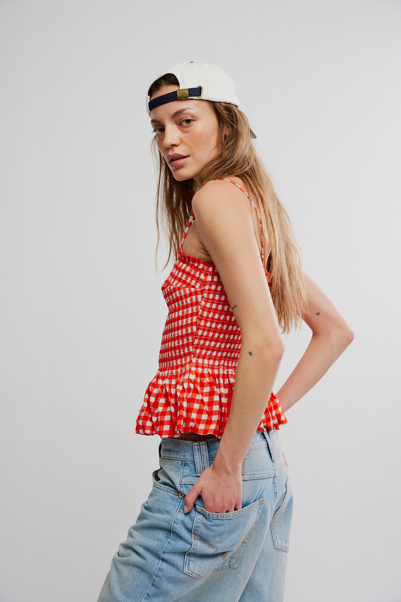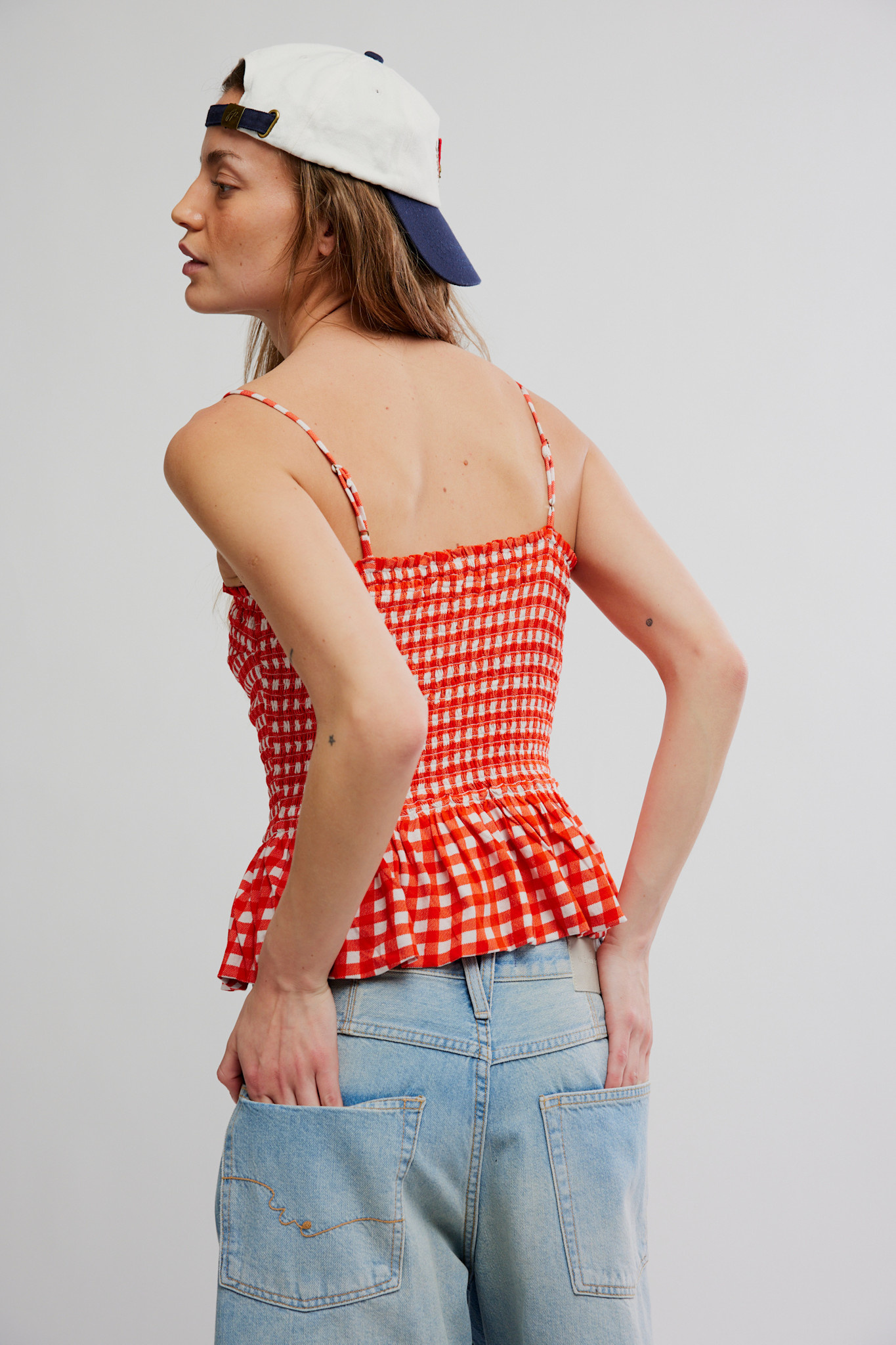 This playful top features a flattering peplum-style silhouette, an airy cotton fabrication, and ruffled details for some femme flair!